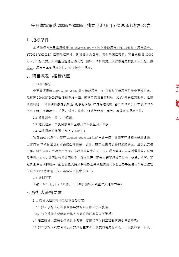 1月23日,宁夏塞塬耀储200MW/800MWh独立储能项目EPC总承包招标公告发布。
