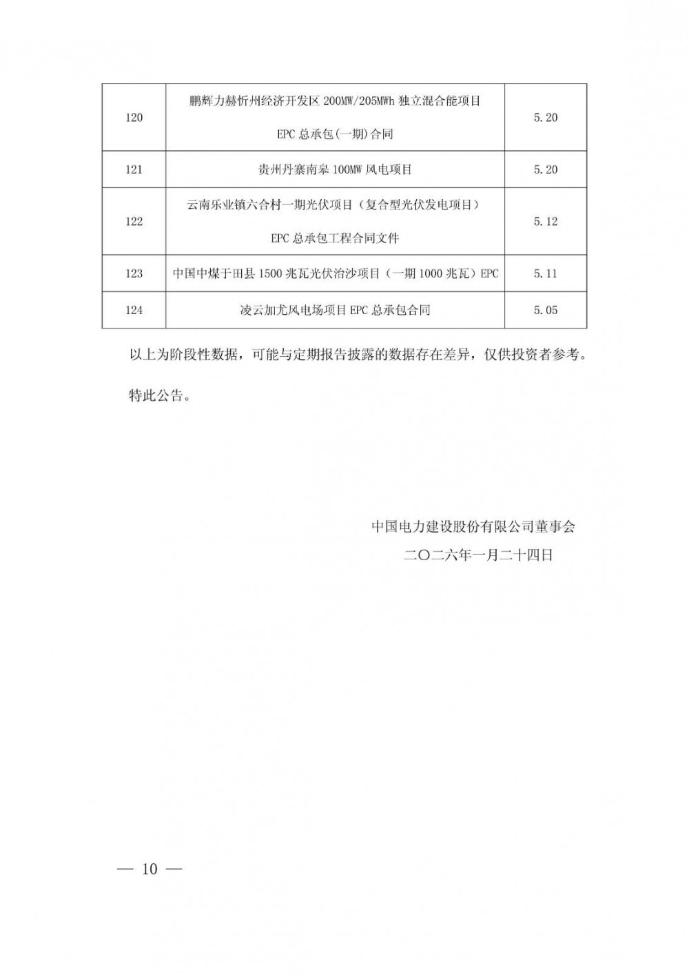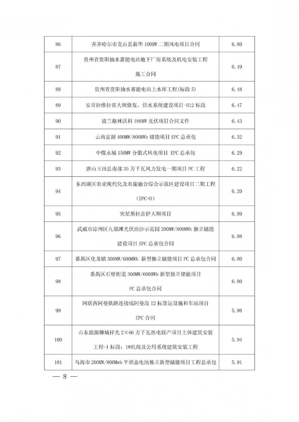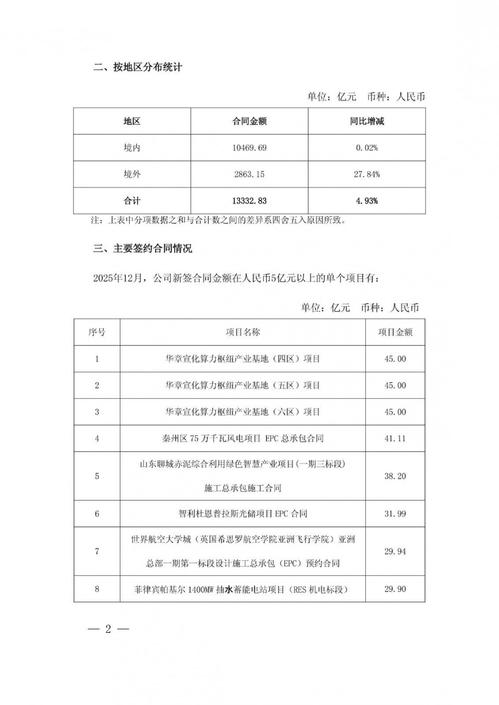 1月24日,中国电建发布《2025年1月至12月主要经营情况公告》。公告披露,2025年1月至12月,中国电建新签项目8558个,新签合同金额13332.83亿元,同比增长4.93%。其中,能源电力项目5297个,新签合同金额8416.05亿元。2025年12月,公司新签合同金额在人民币5亿元以上的单个涉新型储能项目23个,具体如下: