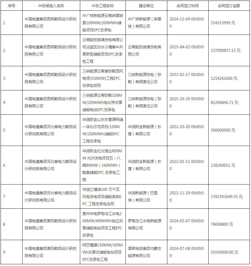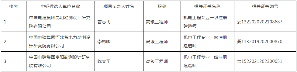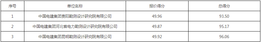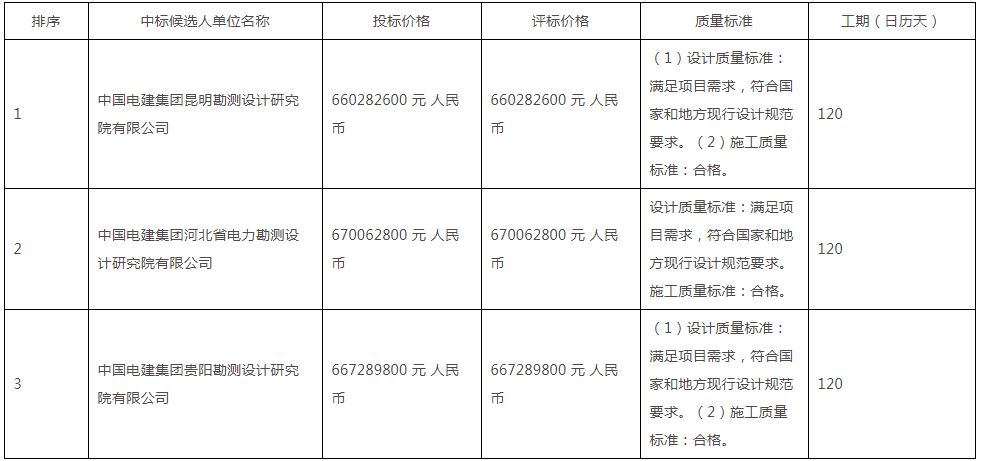 第一中标候选人为中国电建集团昆明勘测设计研究院有限公司,投标报价为660282600元,折合单价0.8254元/Wh;第二中标候选人为中国电建集团河北省电力勘测设计研究院有限公司,投标报价为670062800元,折合单价0.8376元/Wh;第二中标候选人为中国电建集团贵阳勘测设计研究院有限公司,投标报价为667289800元,折合单价0.8341元/Wh。
