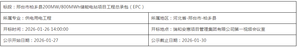 能源圈获悉,1月27日,邢台市柏乡县200MW/800MWh储能电站项目工程总承包(EPC)中标候选人公示。