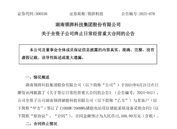 2025年12月17日,领湃科技发布公告称,公司全资子公司湖南领湃储能科技有限公司与某客户签订的《100MW/200MWh储能电站项目储能系统设备采购合同》已终止,原合同金额预计为1.25亿元(含税)。