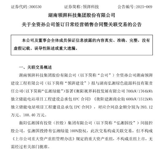 同日,领湃科技还发布公告称,签署了700kW/1764kWh、600kW/1512kWh独立储能电站项目工程建设总承包EPC合同,对应合同总金额分别为393.12万元、188.40万元。