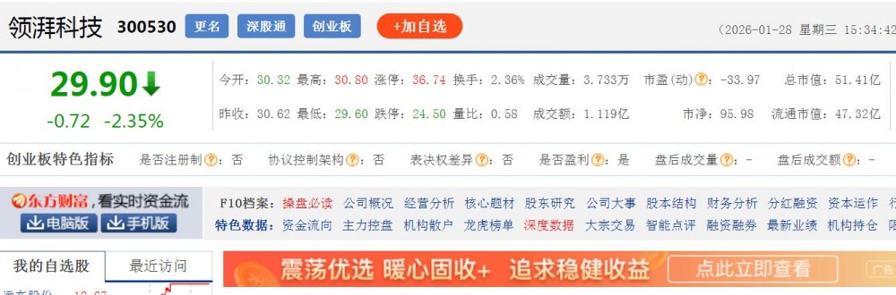 截至1月28日收盘,领湃科技股价为29.9元/股,较前一日下跌2.35%,总市值为51.41亿元。