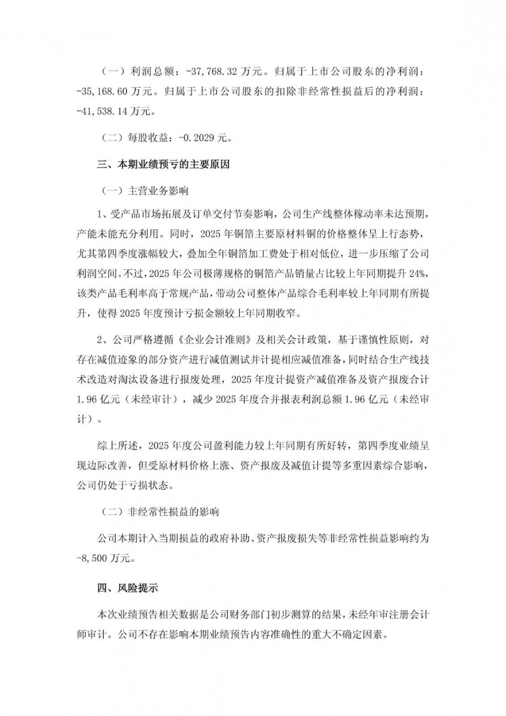 受产品市场拓展及订单交付节奏影响,诺德股份生产线整体稼动率未达预期,产能未能充分利用。同时,2025年铜箔主要原材料铜的价格整体呈上行态势,尤其第四季度涨幅较大,叠加全年铜箔加工费处于相对低位,进一步压缩了公司利润空间。不过,2025年公司极薄规格的铜箔产品销量占比较上年同期提升24%,该类产品毛利率高于常规产品,带动公司整体产品综合毛利率较上年同期有所提升,使得2025年度预计亏损金额较上年同期收窄。
