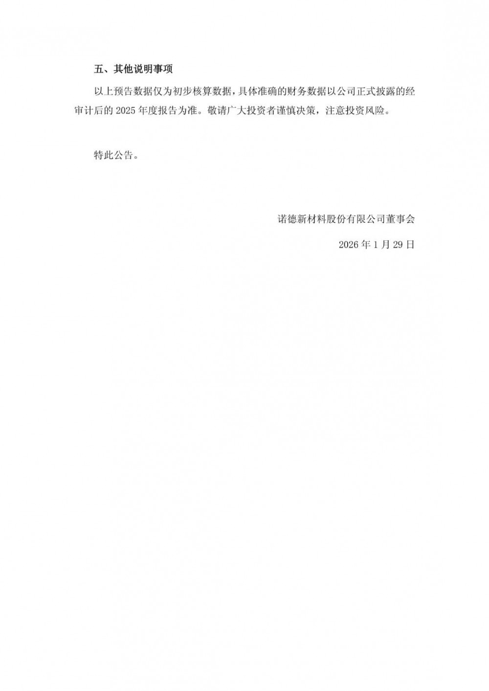 1月28日,诺德股份发布2025年年度业绩预告公告。预计2025年度实现归属于上市公司股东的净利润-26,000万元左右,与上年同期(法定披露数据)相比,亏损金额同比收窄26.07%左右。预计2025年度实现归属于上市公司股东的扣除非经常性损益后的净利润-17,500万元左右。
