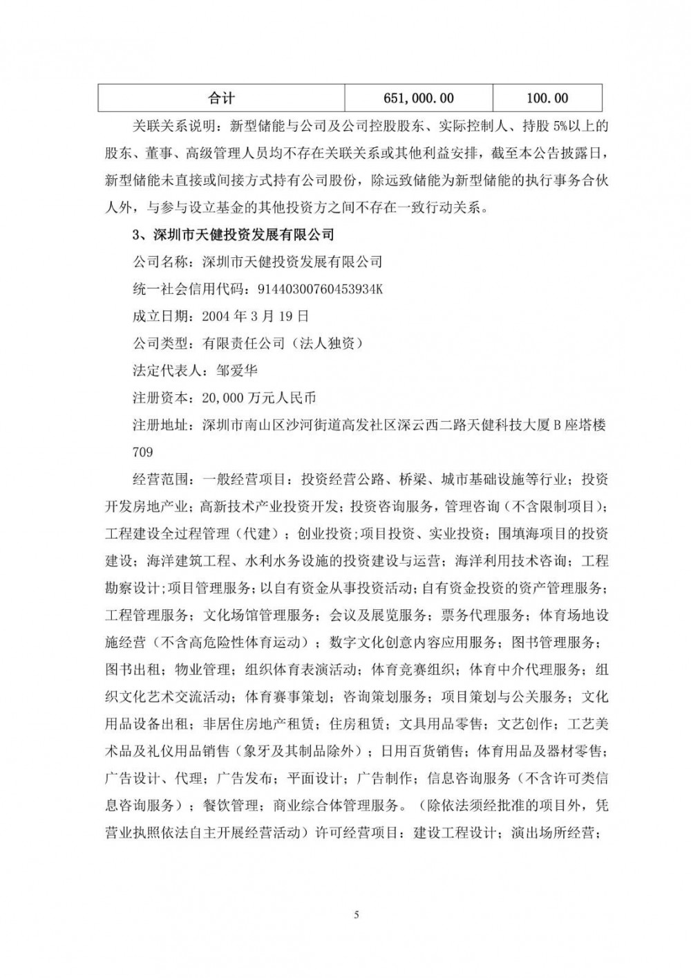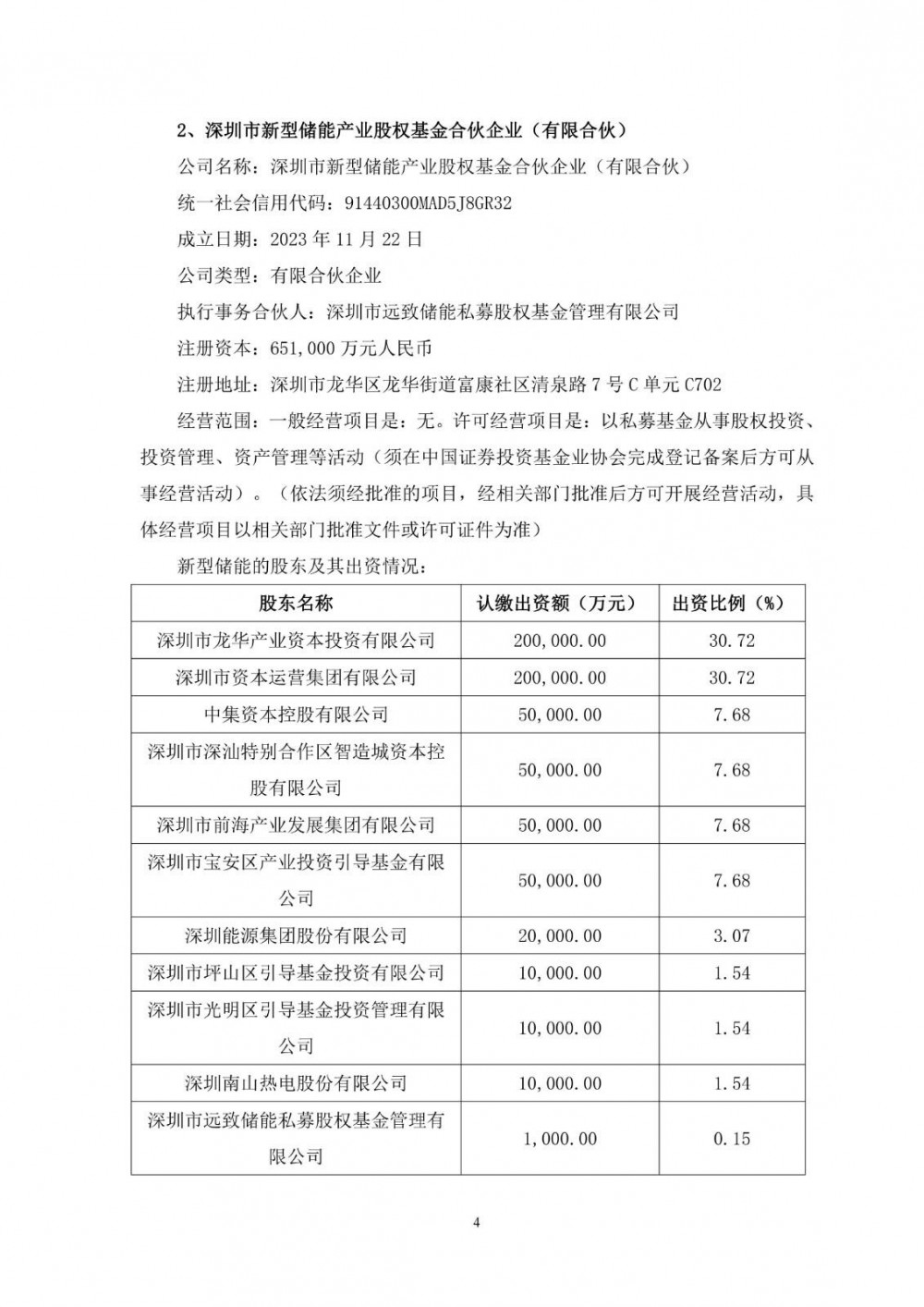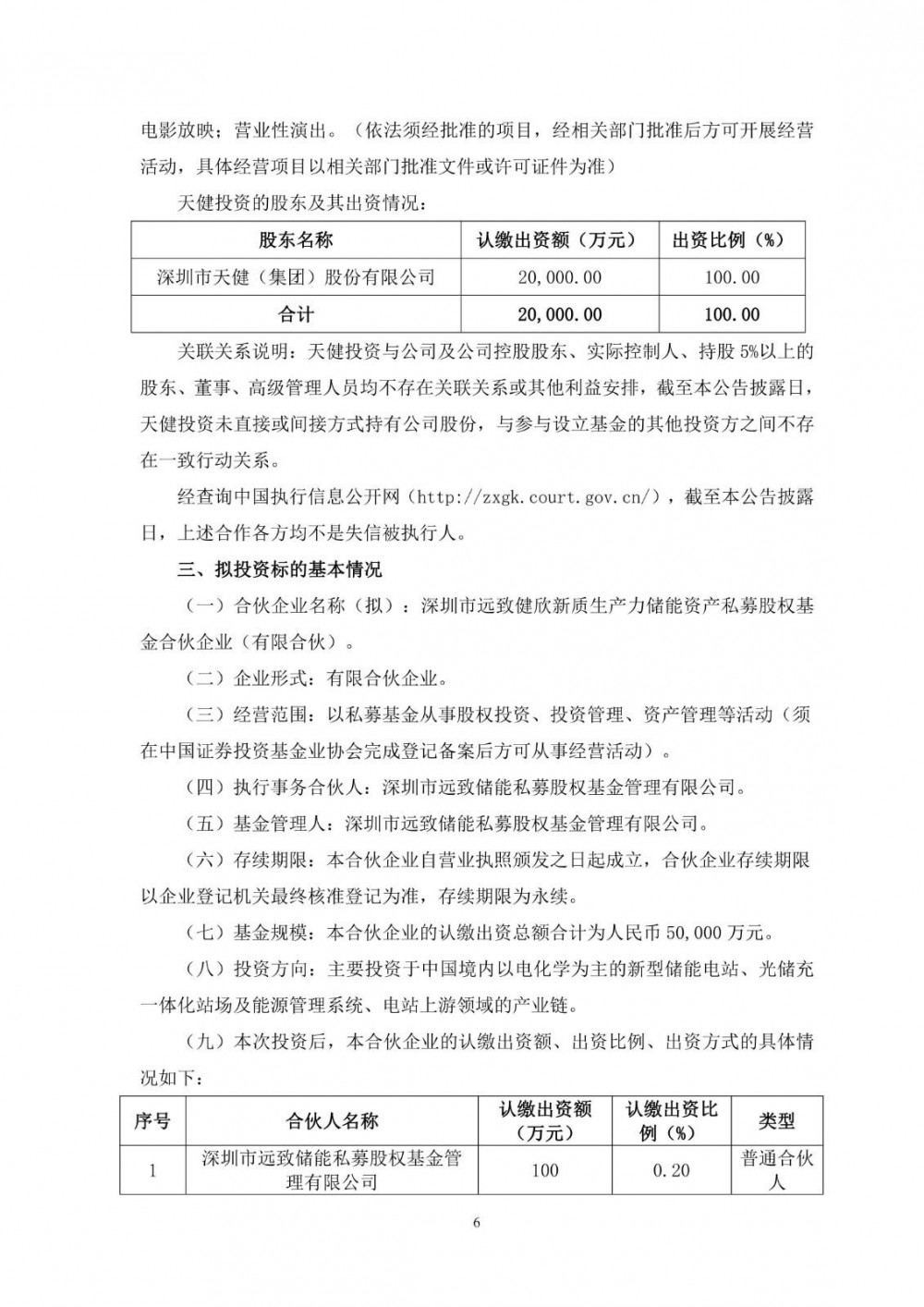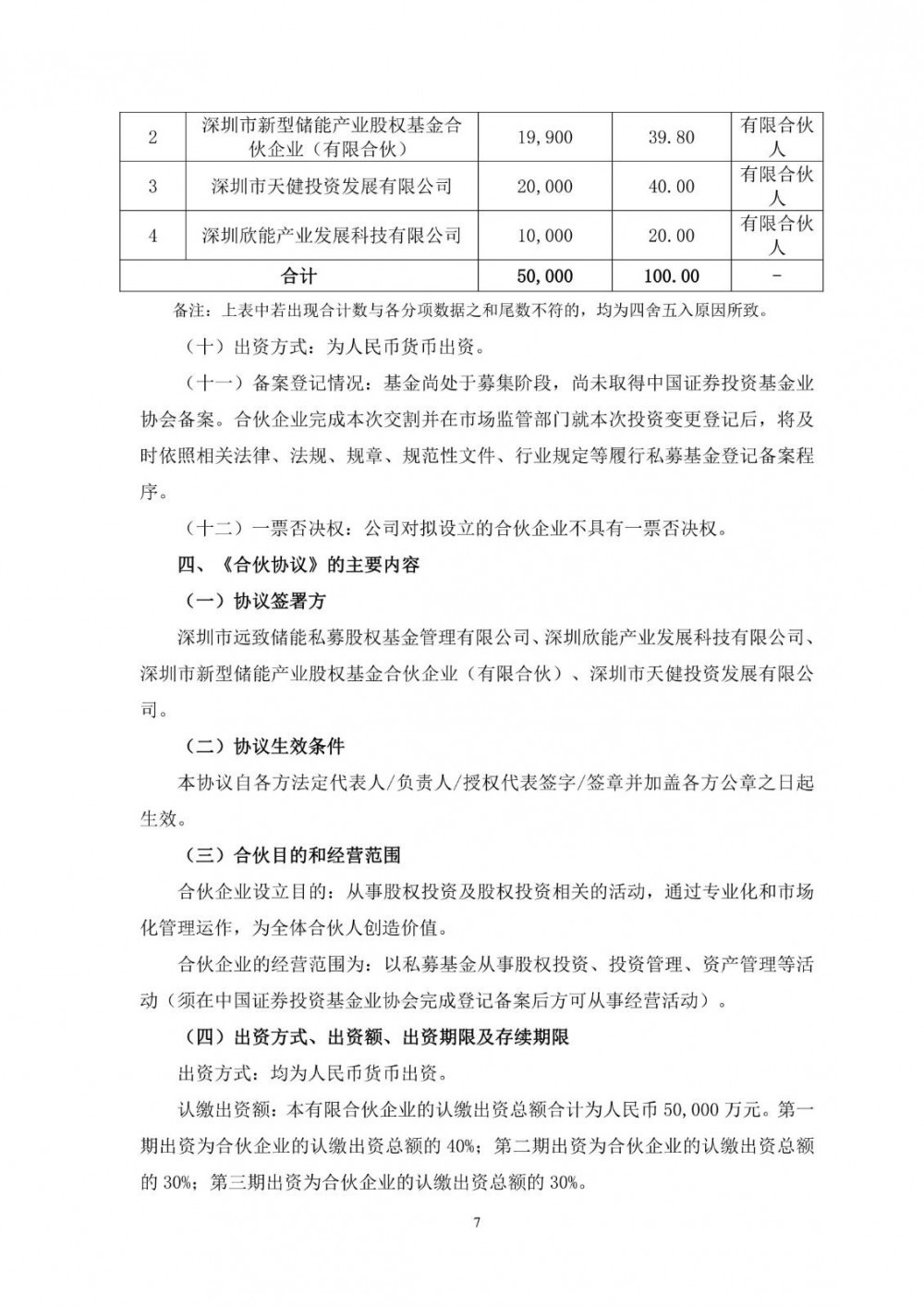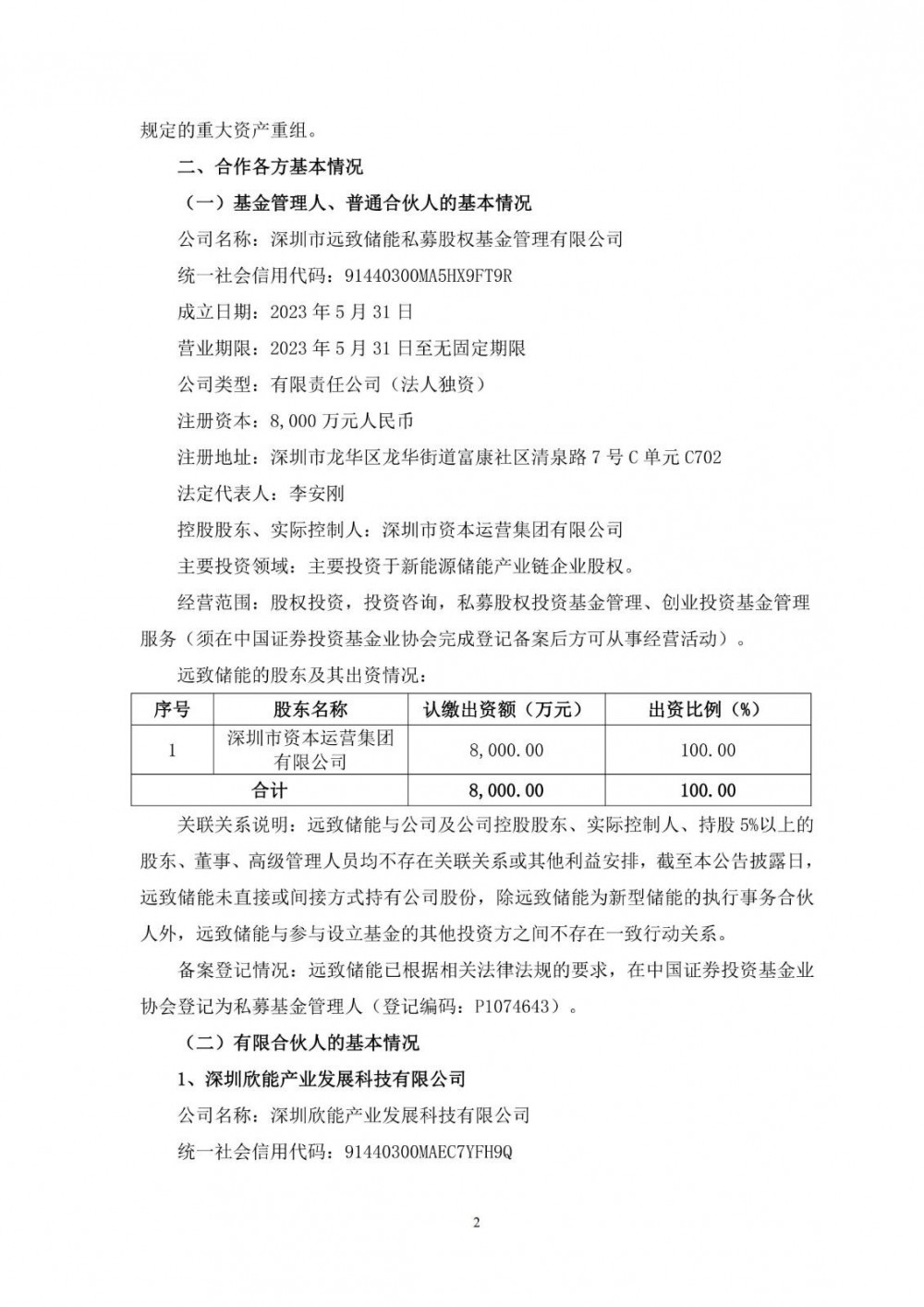 该合伙企业认缴出资总额为人民币50,000万元,其中有限合伙人欣能科技认缴出资额为人民币10,000万元,认缴比例为20%;有限合伙人新型储能认缴出资额为人民币19,900万元,认缴比例为39.80%;有限合伙人天健投资认缴出资额为人民币20,000万元,认缴比例为40%;普通合伙人远致储能认缴出资额为人民币100万元,认缴比例为0.20%。以上出资方式均为人民币货币出资。专业投资机构远致储能担任远致健欣的私募基金管理人。投资方向主要为投资于以电化学为主的新型储能电站、光储充一体化站场及能源管理系统、电站上游领域的产业链。