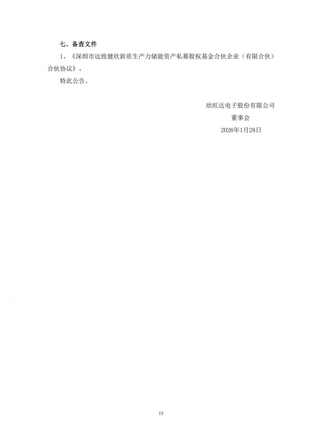 1月28日,欣旺达发布公告称,公司全资子公司深圳欣能产业发展科技有限公司拟与普通合伙人深圳市远致储能私募股权基金管理有限公司、有限合伙人深圳市新型储能产业股权基金合伙企业(有限合伙)(、有限合伙人深圳市天健投资发展有限公司签署《深圳市远致健欣新质生产力储能资产私募股权基金合伙企业(有限合伙)合伙协议》,拟共同投资深圳市远致健欣新质生产力储能资产私募股权基金合伙企业(有限合伙)(以设立时核准的名称为准,下同)。