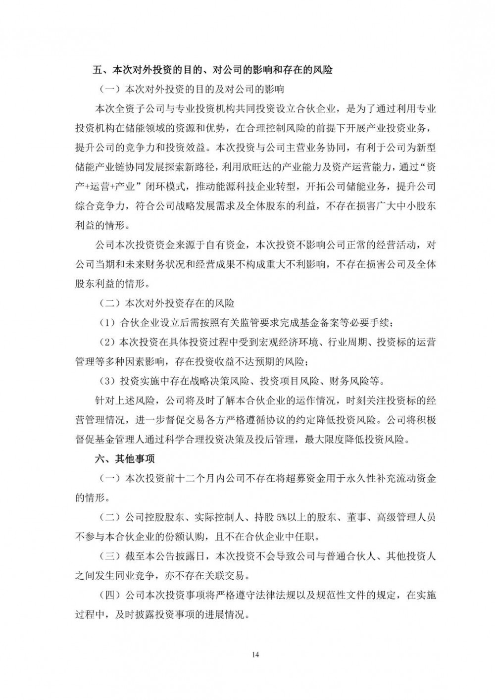 欣旺达表示,本次全资子公司与专业投资机构共同投资设立合伙企业,是为了通过利用专业投资机构在储能领域的资源和优势,在合理控制风险的前提下开展产业投资业务,提升公司的竞争力和投资效益。本次投资与公司主营业务协同,有利于公司为新型储能产业链协同发展探索新路径,利用欣旺达的产业能力及资产运营能力,通过“资产+运营+产业”闭环模式,推动能源科技企业转型,开拓公司储能业务,提升公司综合竞争力,符合公司战略发展需求及全体股东的利益,不存在损害广大中小股东利益的情形。