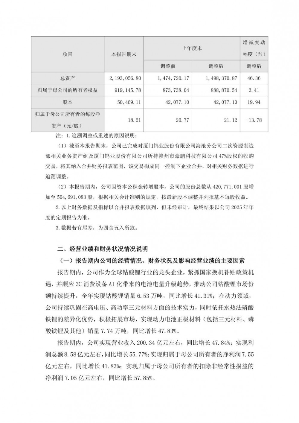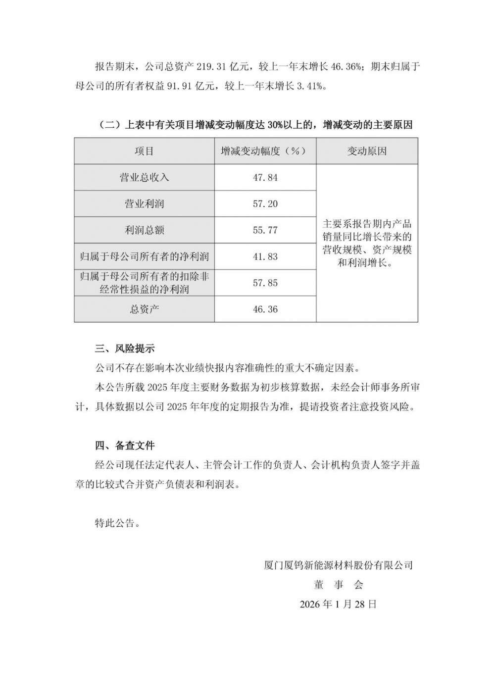 1月28日,厦钨新能发布2025年度业绩快报公告。报告期内,公司实现营业收入200.34亿元左右,同比增长47.84%;实现利润总额8.58亿元左右,同比增长55.77%;实现归属于母公司所有者的净利润7.55亿元左右,同比增长41.83%;实现归属于母公司所有者的扣除非经常性损益的净利润7.05亿元左右,同比增长57.85%。