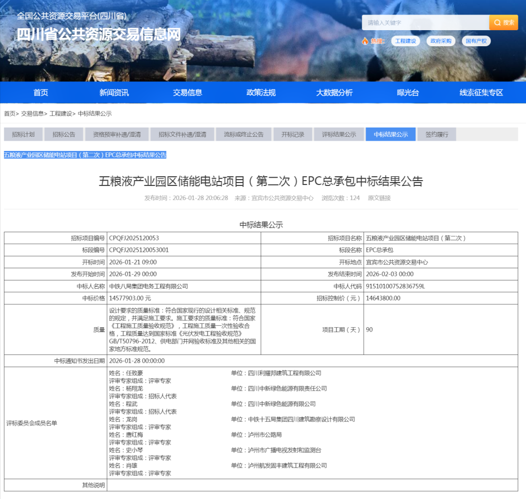 能源圈获悉,1月28日,五粮液产业园区储能电站项目(第二次)EPC总承包中标结果公布,中铁八局集团电务工程有限公司最终中标,中标价格1457.7903万元,中标单价为0.7289元/Wh。