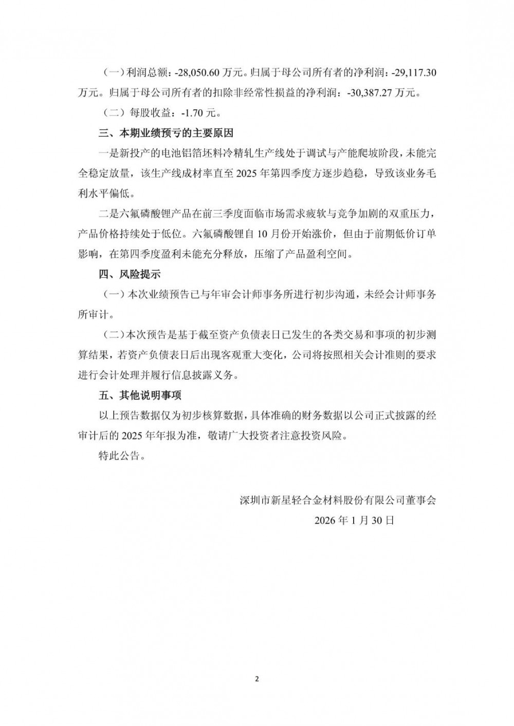 1月29日,深圳新星发布2025年年度业绩预亏公告。预计2025年度实现归属于母公司所有者的净利润为-6,900.00万元到-4,600.00万元,与上年同期相比,亏损减少22,217.30万元到24,517.30万元。