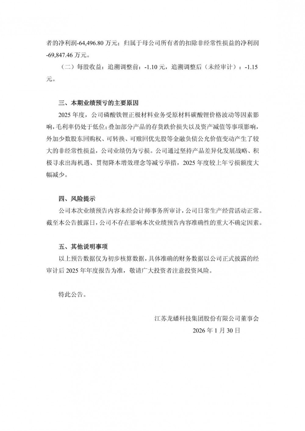 2025年度,龙蟠科技磷酸铁锂正极材料业务受原材料碳酸锂价格波动等因素影响,毛利率仍处于低位;叠加部分产品的存货跌价损失以及资产减值等事项影响,外加少数股东回购权、可转换、可赎回优先股等金融负债公允价值变动产生了较大的非经常性损益,公司业绩仍为亏损。公司通过坚持产品差异化发展战略、积极寻求出海机遇、贯彻降本增效理念等减亏举措,2025年度较上年亏损额度大幅减少。