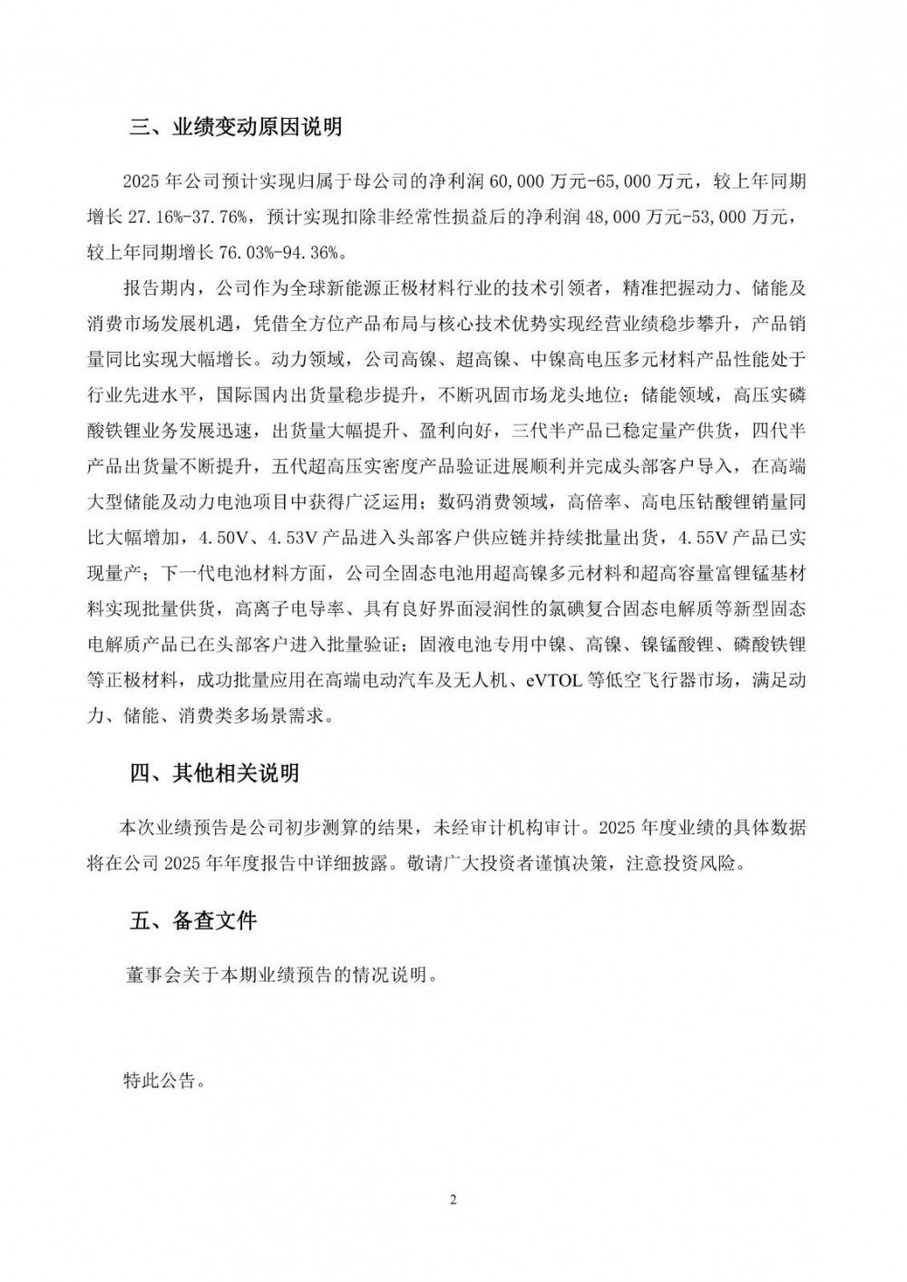 1月29日,当升科技发布2025年度业绩预告。2025年公司预计实现归属于母公司的净利润60,000万元-65,000万元,较上年同期增长27.16%-37.76%,预计实现扣除非经常性损益后的净利润48,000万元-53,000万元,较上年同期增长76.03%-94.36%。