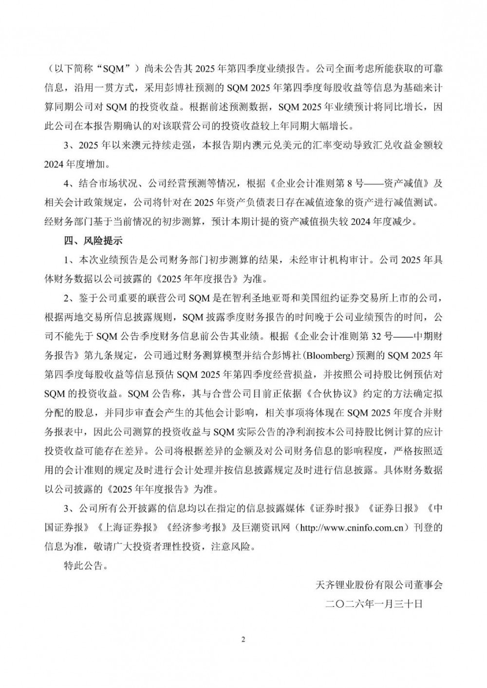1月29日,天齐锂业发布2025年度业绩预告。预计将盈利3.69亿元—5.53亿元,去年同期为亏损79.05亿元;扣除非经常性损益后净利润为2.4亿元—3.6亿元,去年同期亏损79.23亿元。