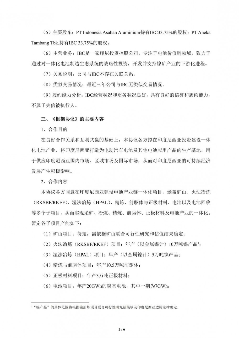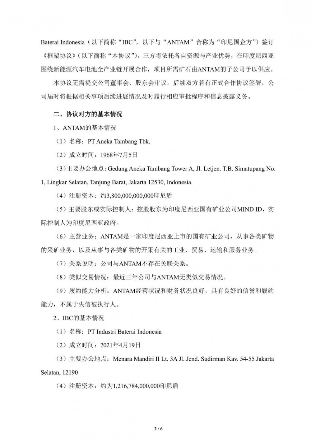 Baterai Indonesia签订《框架协议》(以下简称“本协议”),三方将依托各自资源与产业优势,在印度尼西亚围绕新能源汽车电池全产业链开展合作,项目所需矿石由ANTAM的子公司予以供应。