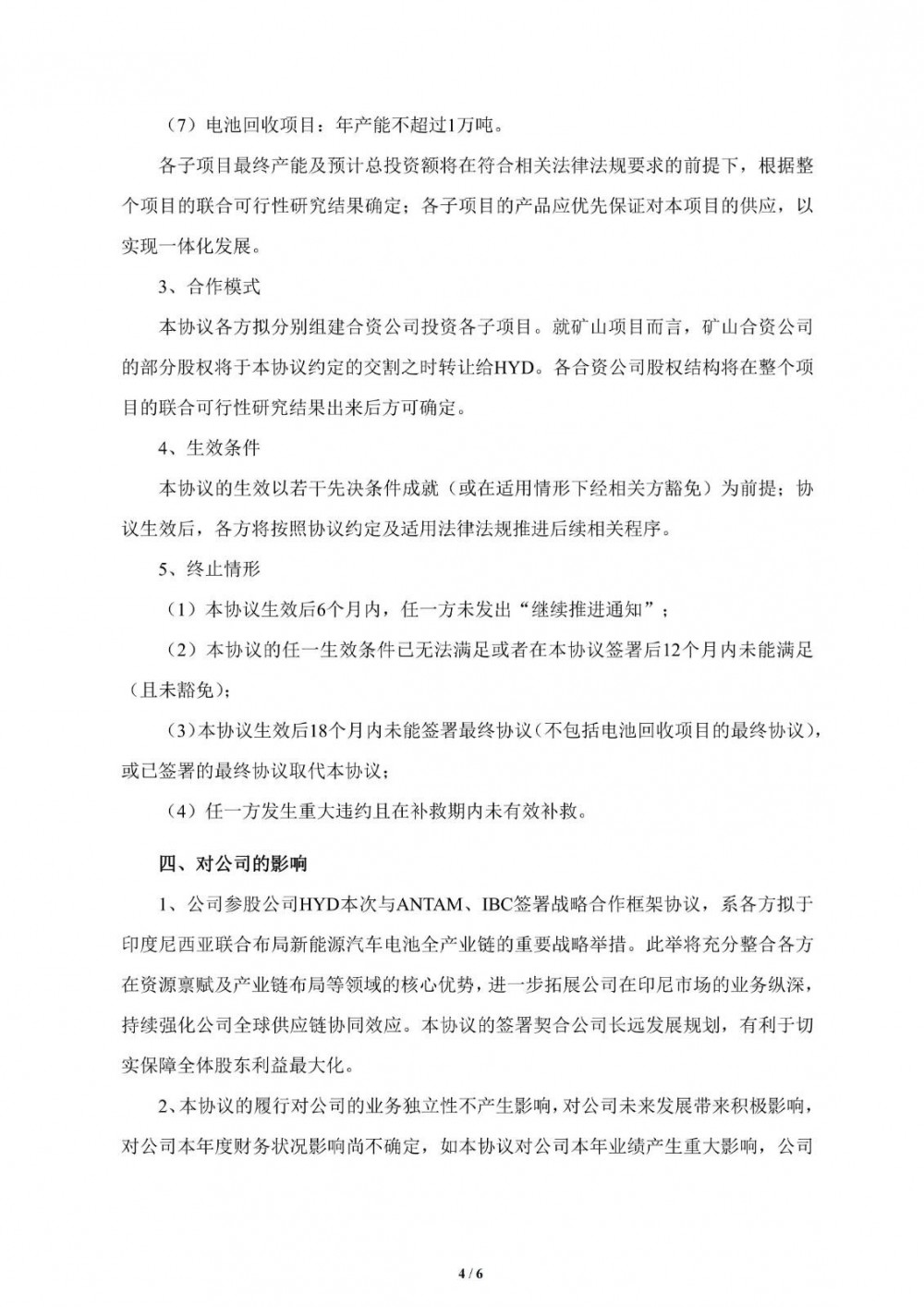 本协议各方拟在印度尼西亚投资建设一体化电池产业,将印度尼西亚打造为电动汽车电池及其他电池应用产品的生产基地,用于供应印度尼西亚国内市场、区域市场及国际市场,从而对印度尼西亚的可持续经济发展产生积极影响。