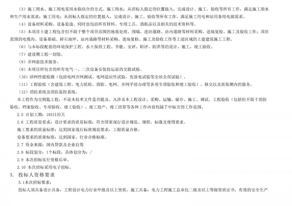 投标人须具备设计具备:工程设计电力行业甲级及以上资质,施工具备:电力工程施工总承包二级及以上等级资质证书,有效的安全生产许可证资质,投标人近五年(2021年1月1日至今,以合同签订时间为准)承担过1项50MW/100MWh及以上规模已投运的储能项目类似工程总承包项目业绩(联合体投标的,业绩由牵头单位提供,提供合同证明材料,包含合同封面、关键内容页、签字盖章页;同时提供完工证明材料)的类似项目业绩,并在人员、设备、资金等方面具有相应的施工能力。