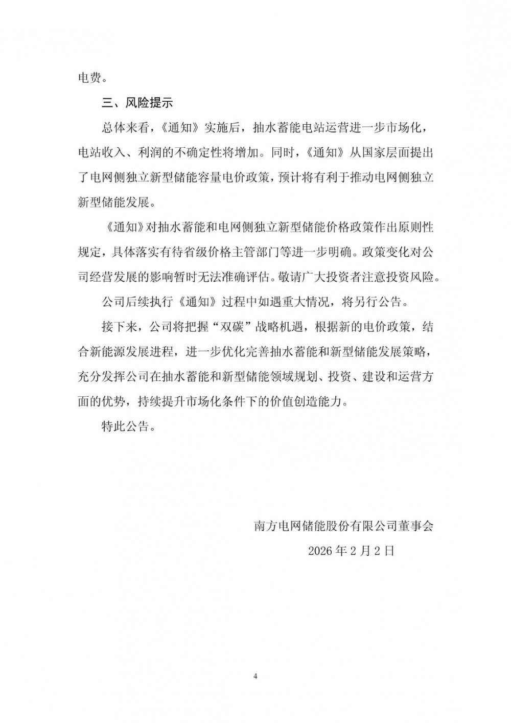 2月2日,南方电网储能股份有限公司发布关于抽水蓄能和新型储能价格政策调整及其对公司影响的公告。