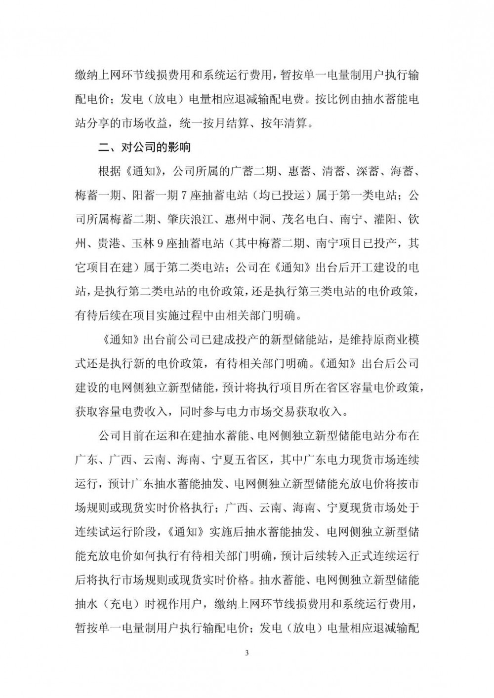 根据《通知》,公司所属的广蓄二期、惠蓄、清蓄、深蓄、海蓄、梅蓄一期、阳蓄一期7座抽蓄电站(均已投运)属于第一类电站;公司所属梅蓄二期、肇庆浪江、惠州中洞、茂名电白、南宁、灌阳、钦州、贵港、玉林9座抽蓄电站(其中梅蓄二期、南宁项目已投产,其它项目在建)属于第二类电站;公司在《通知》出台后开工建设的电站,是执行第二类电站的电价政策,还是执行第三类电站的电价政策,有待后续在项目实施过程中由相关部门明确。