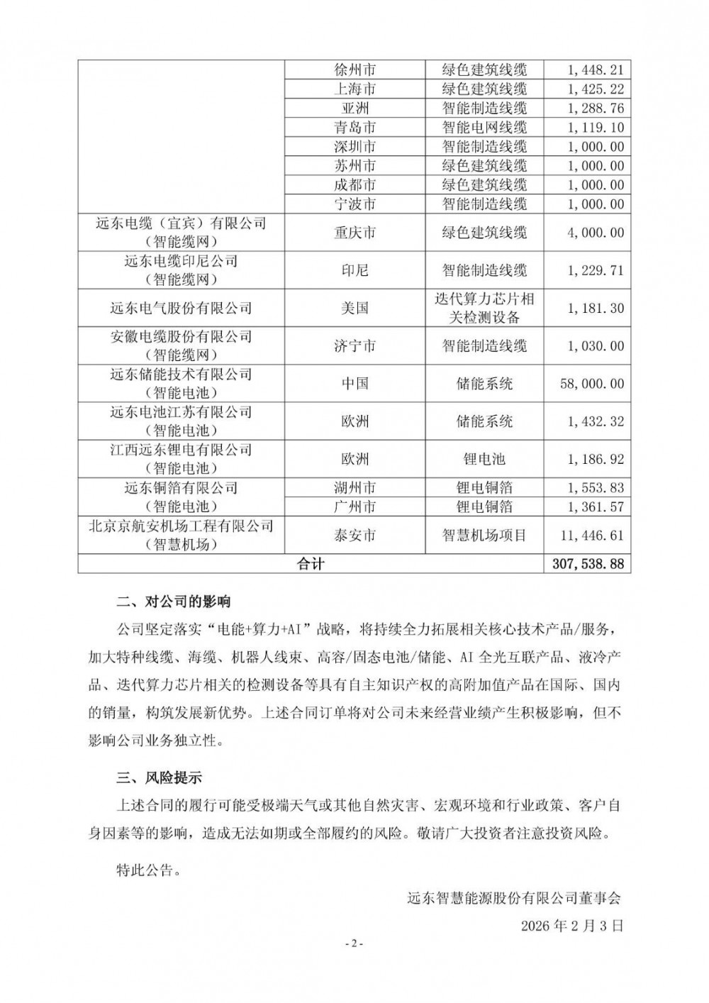 2月3日,远东股份披露子公司中标项目的提示性公告,2026年1月,其子公司中标、签约千万元以上合同订单合计为人民币307538.88万元,其中储能系统相关合同金额为5.94亿元,锂电池相关合同金额为1186.9千万。