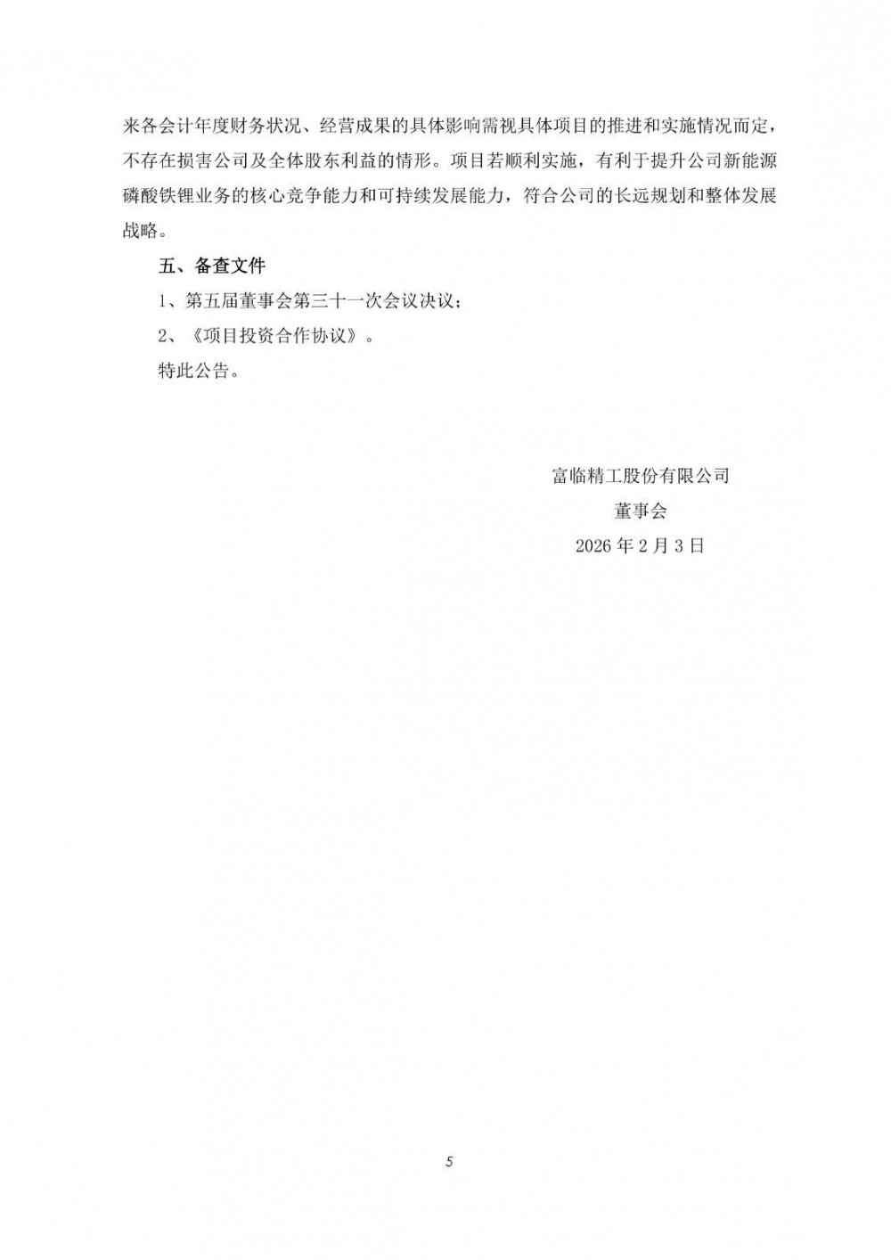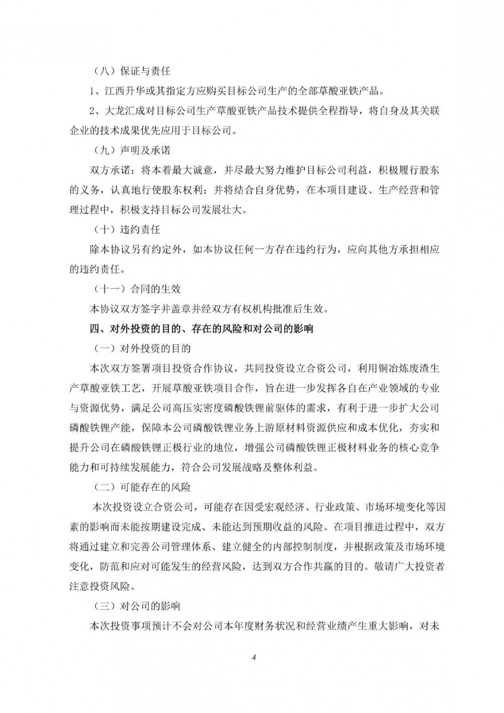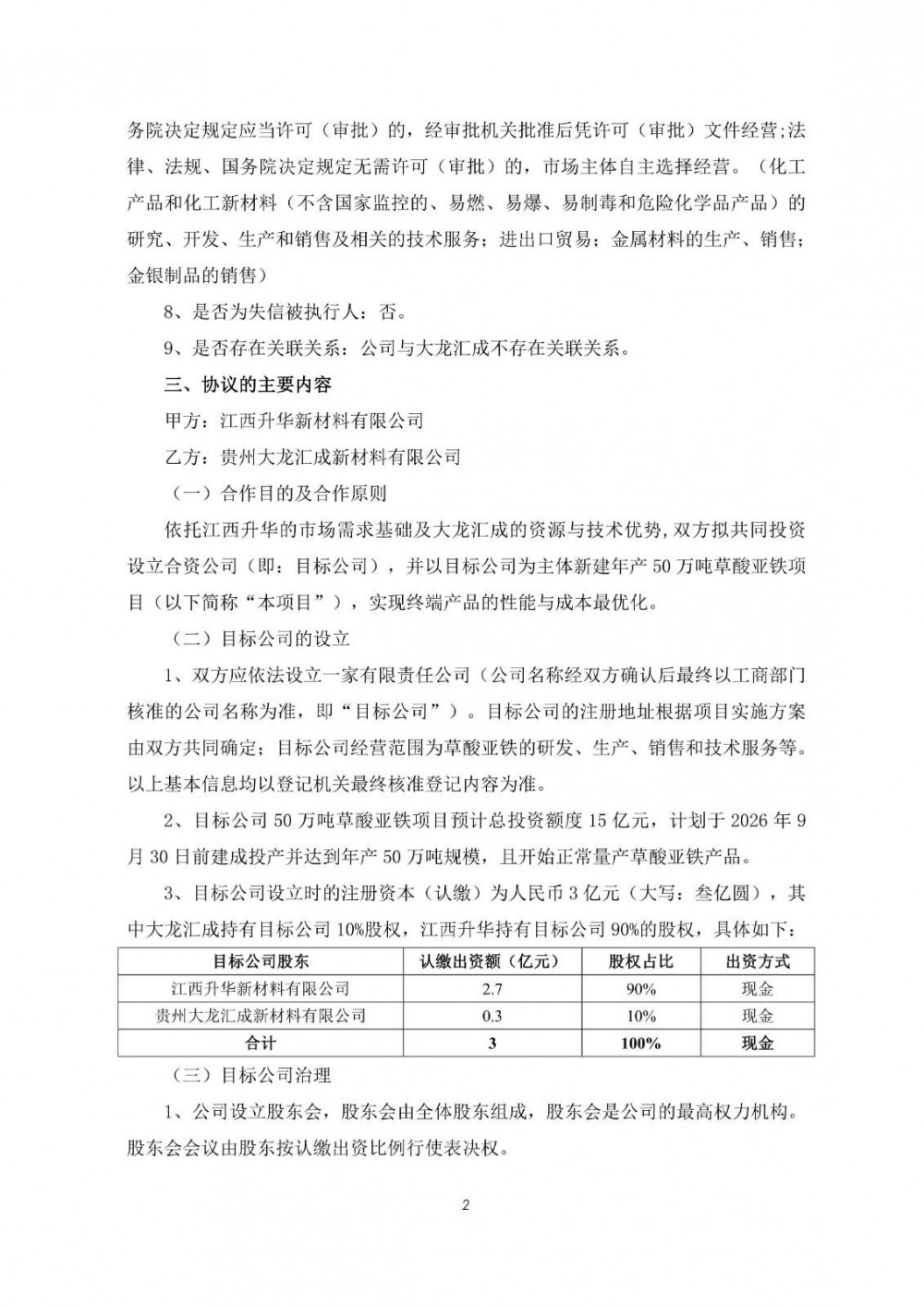2月3日,富临精工发布公告称,公司召开第五届董事会第三十一次会议,审议通过了《关于子公司签订<项目投资合作协议>暨新建年产50万吨草酸亚铁项目的议案》。为进一步发挥各自在产业领域的专业与资源优势,实现在新能源产业链上下游的合作,共同推动新能源产业的发展,公司子公司江西升华新材料有限公司拟与贵州大龙汇成新材料有限公司签订《项目投资合作协议》,双方拟共同投资设立合资公司,并以目标公司为主体新建年产50万吨草酸亚铁项目。目标公司的注册资本为30,000万元,其中江西升华拟出资27,000万元,持有目标公司90%的股权;大龙汇成拟出资3,000万元,持有目标公司10%的股权。