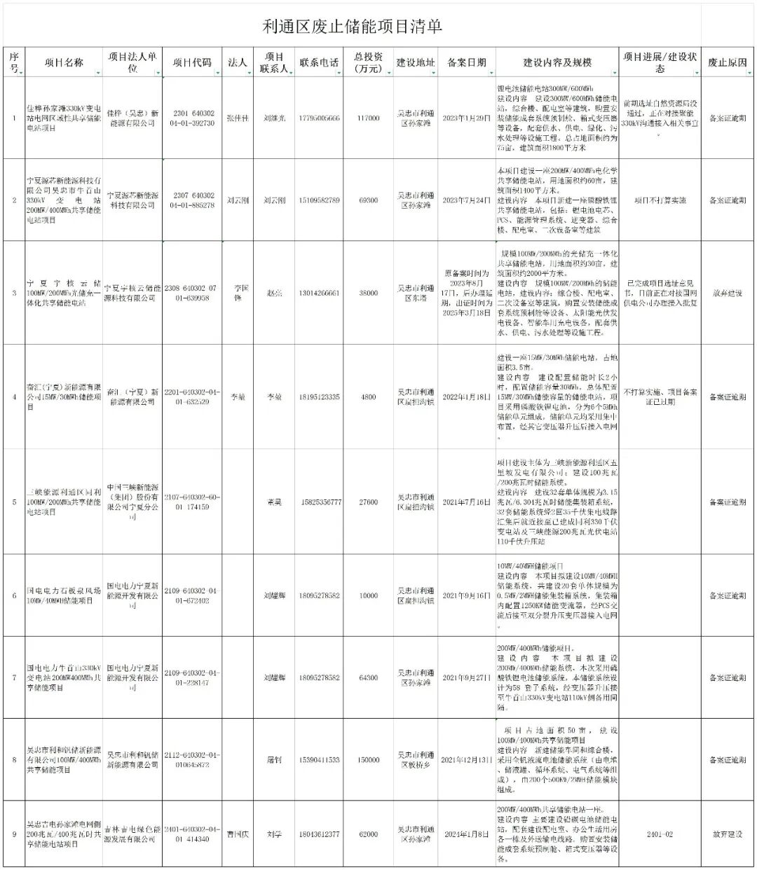 利通区发展和改革局关于废止一批储能项目的公告