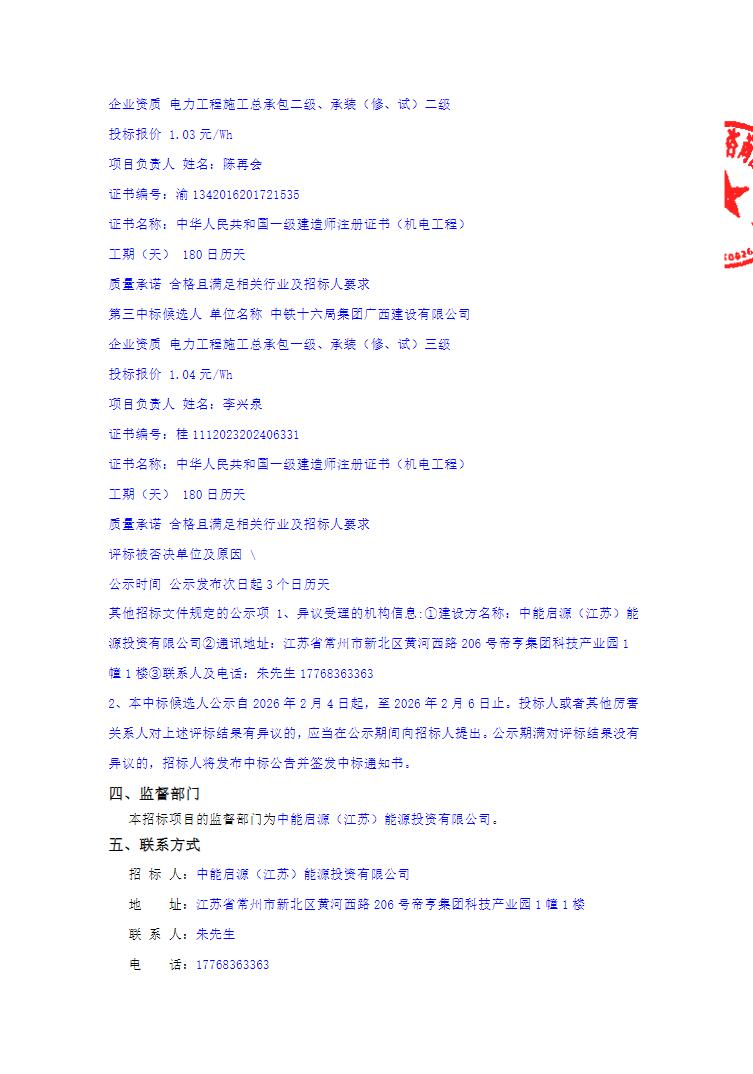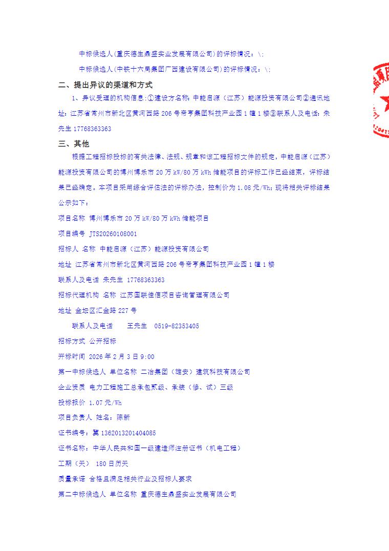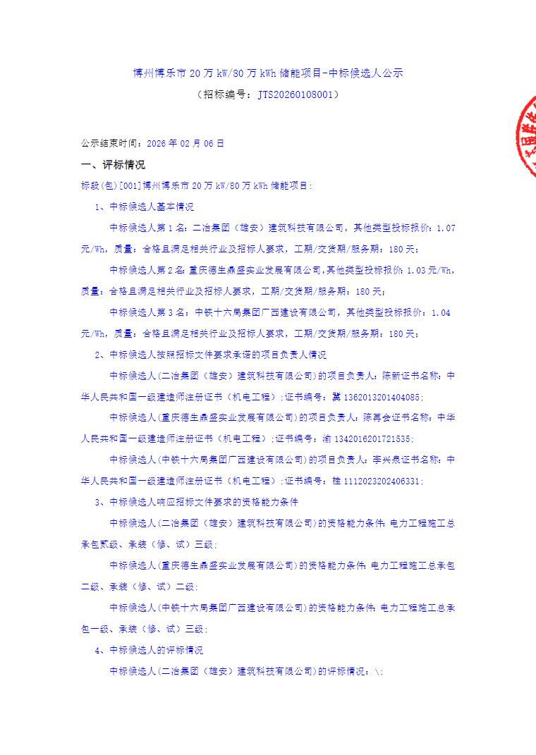 第一中标候选人为二冶集团(雄安)建筑科技有限公司,折合单价1.07元/Wh;第二中标候选人为重庆德生鼎盛实业发展有限公司,折合单价1.03元/Wh;第三中标候选人为中铁十六局集团广西建设有限公司,折合单价1.04元/Wh。
