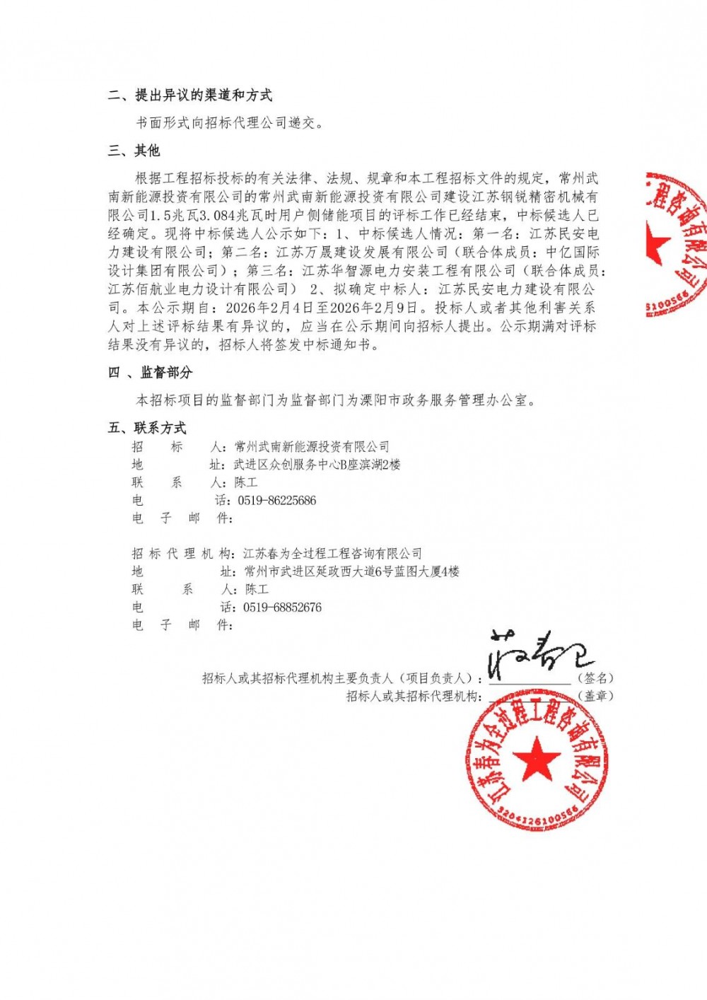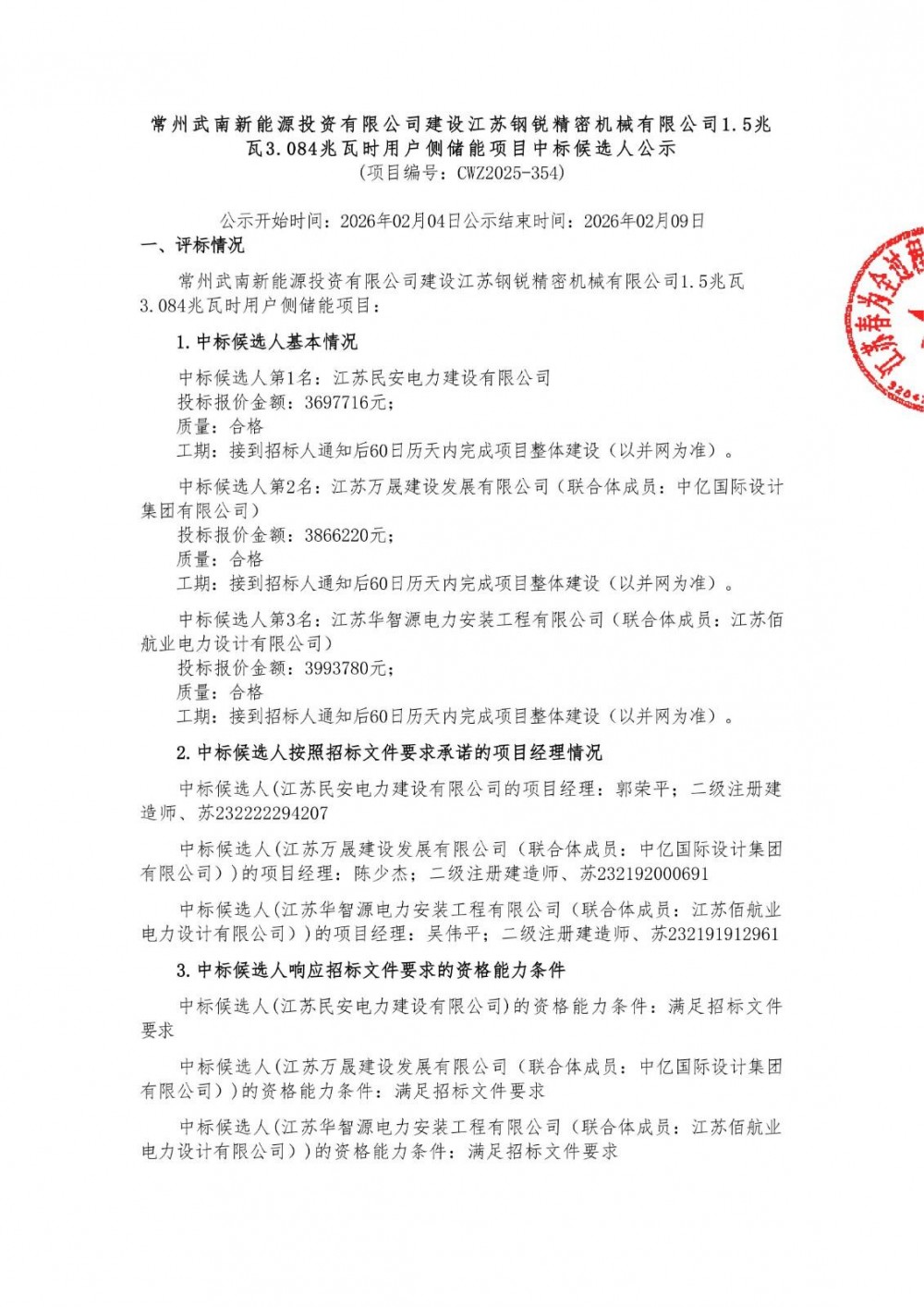 2月4日,常州武南新能源投资有限公司建设江苏钢锐精密机械有限公司1.5兆瓦3.084兆瓦时用户侧储能项目中标候选人公示。