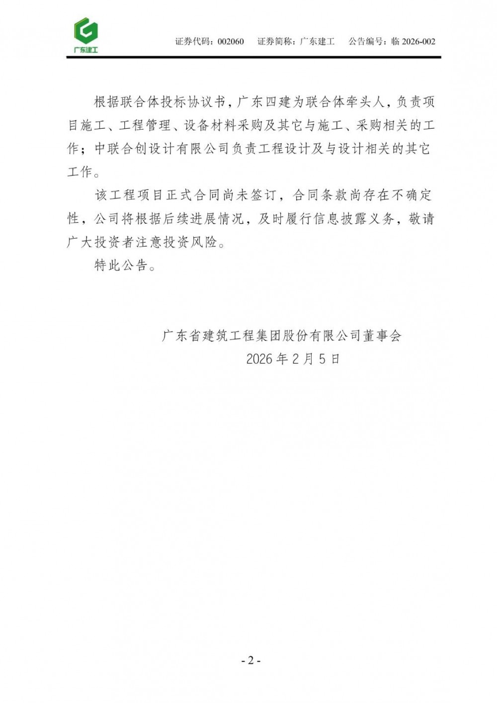 2月4日,广东建工发布公告称,公司的全资子公司广东省第四建筑工程有限公司收到深圳市弘铭项目管理有限公司发来的《中标通知书》,相关内容公告如下: