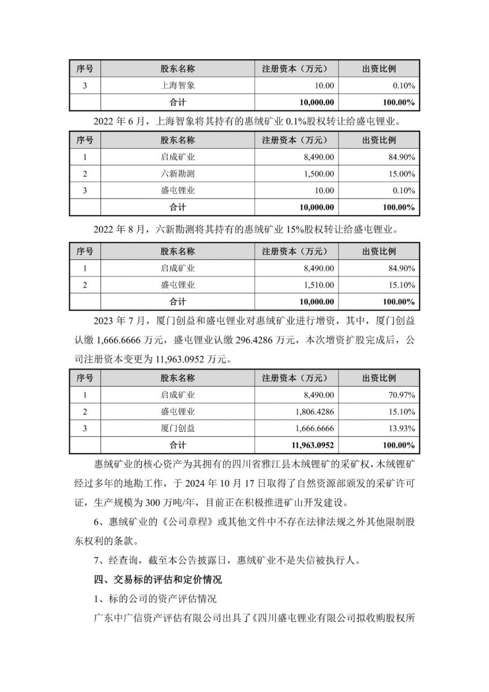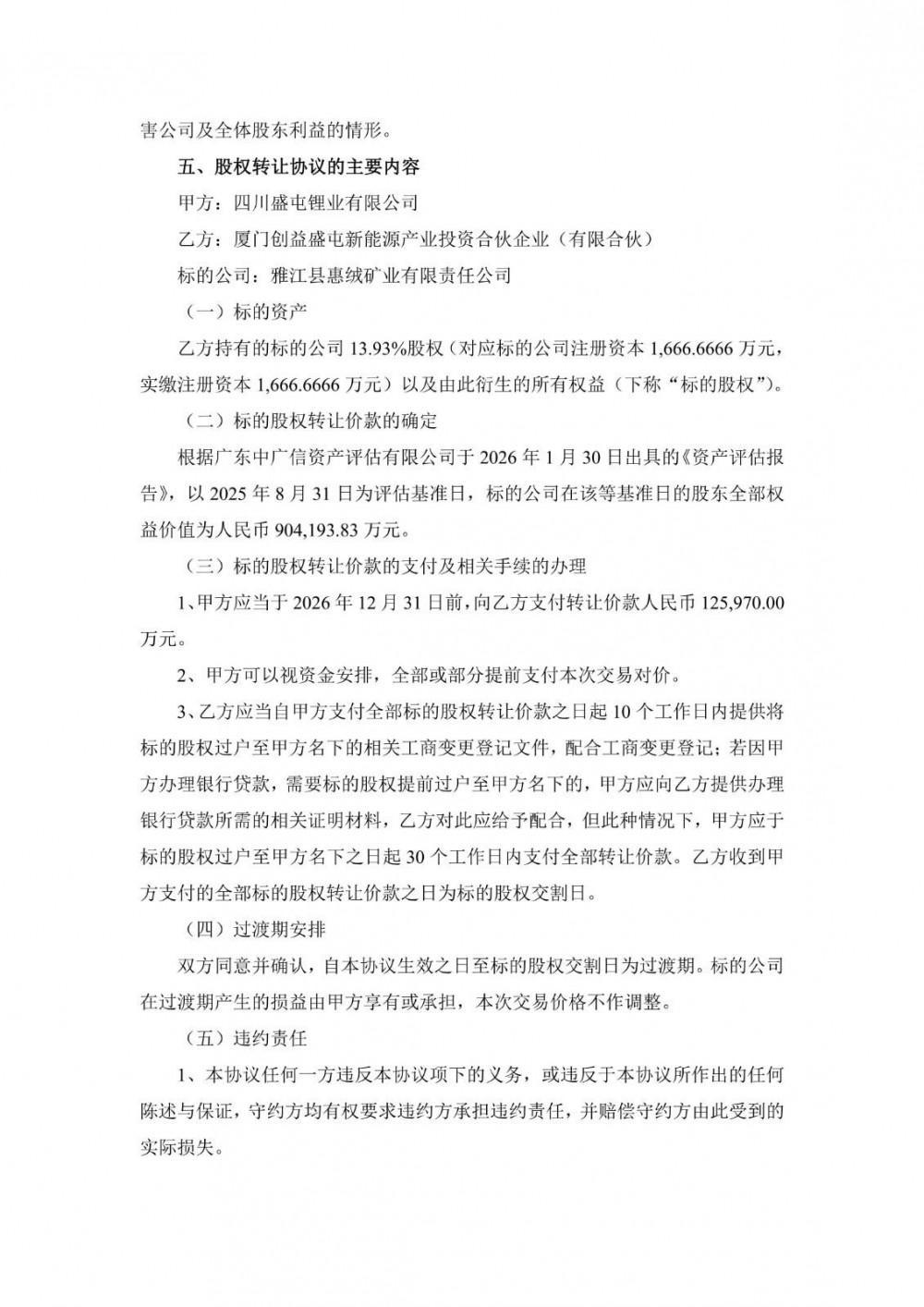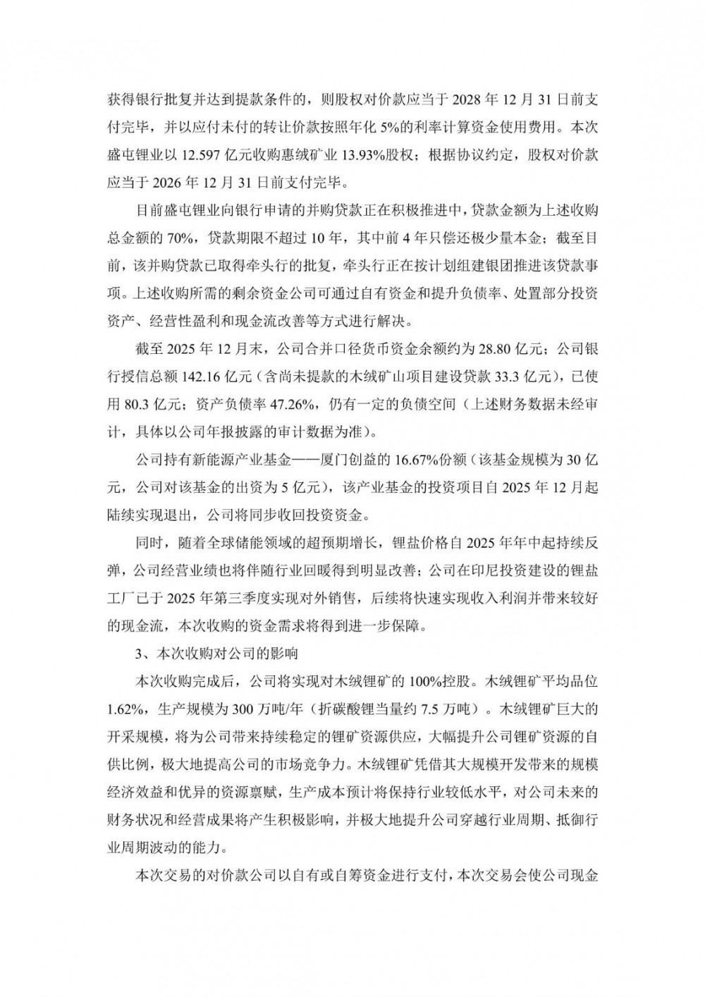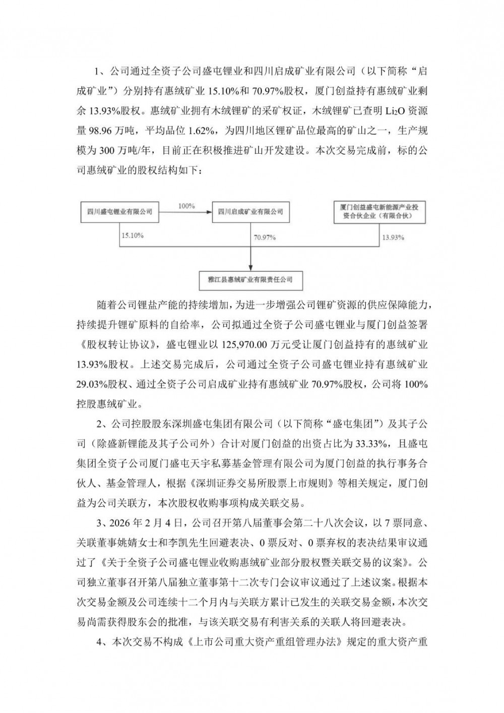 2月4日,盛新锂能发布公告称,公司全资子公司四川盛屯锂业有限公司拟以现金人民币125,970.00万元收购厦门创益盛屯新能源产业投资合伙企业(有限合伙)持有的雅江县惠绒矿业有限责任公司13.93%股权,本次交易完成后,公司将100%控股惠绒矿业。