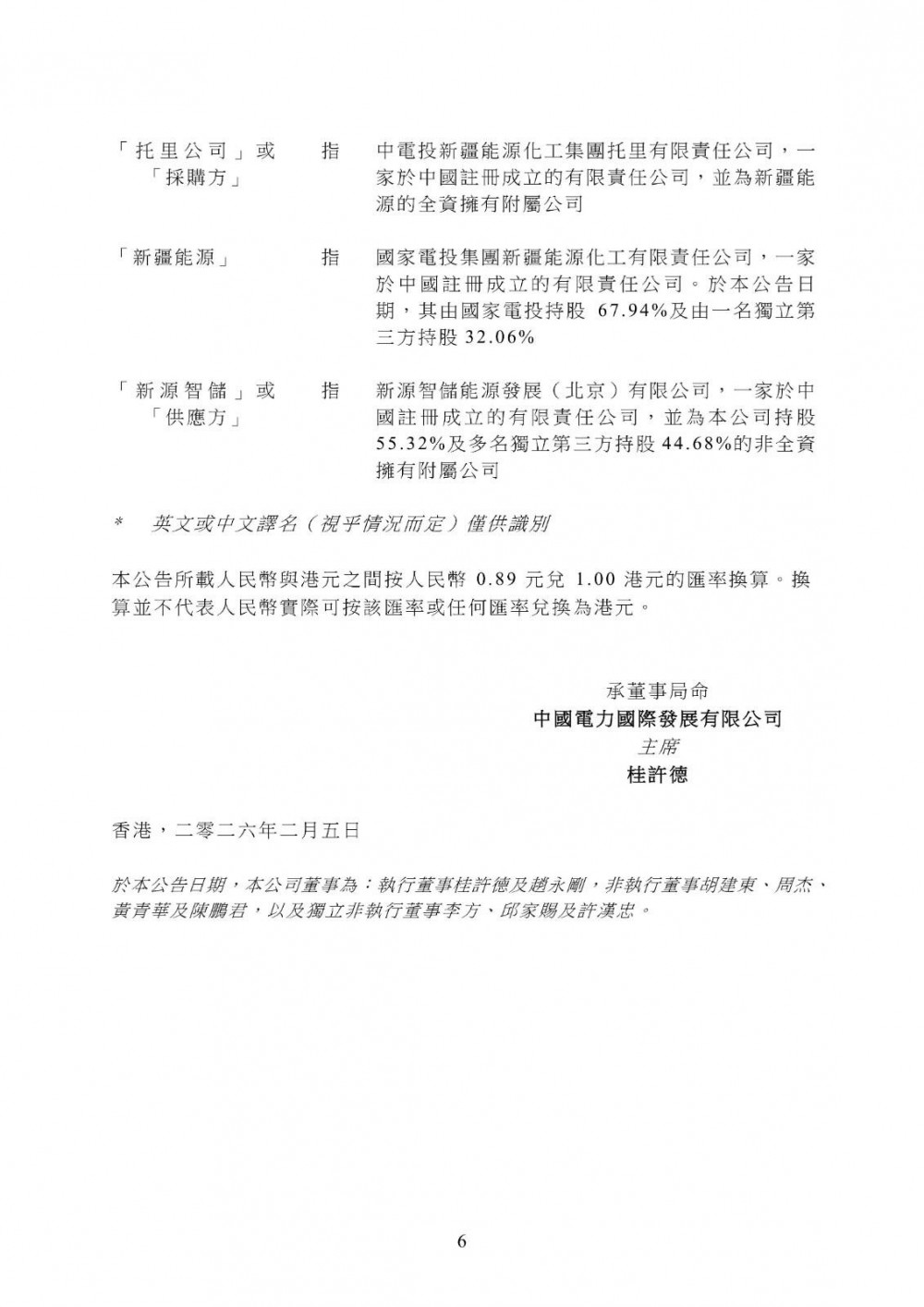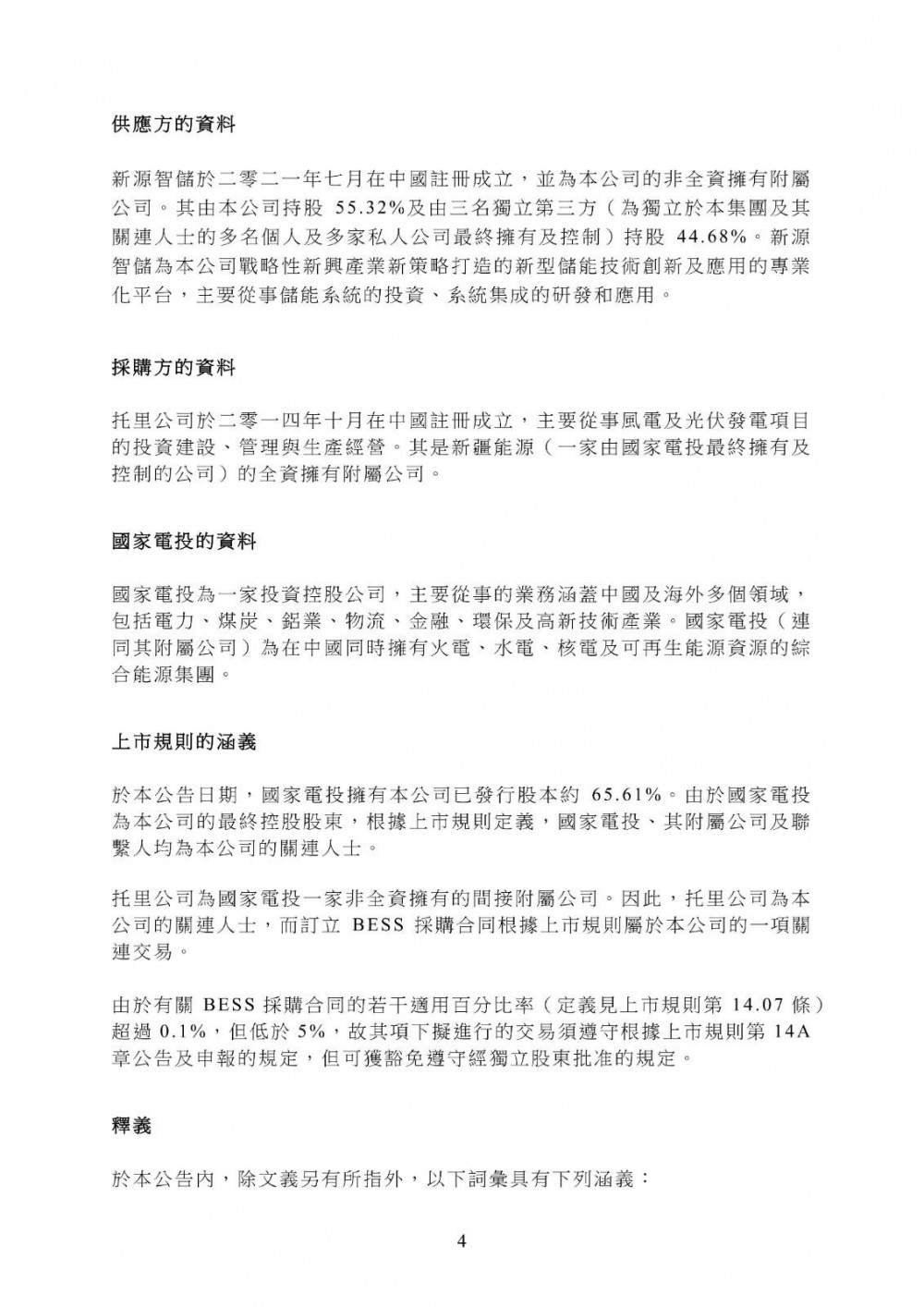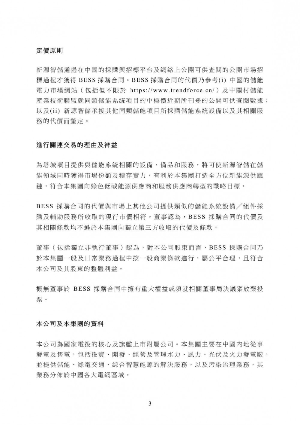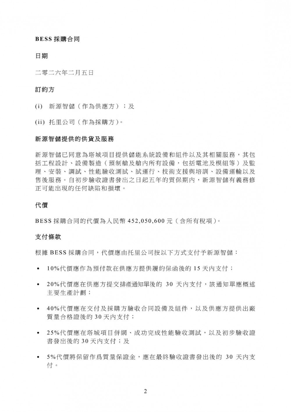 2月5日,中国电力发布公告称,本公司非全资拥有附属公司新源智储作为供应方与托里公司订立了一份BESS采购合同,据此新源智储将为塔城项目提供储能系统设备和组件以及其相关服务,代价人民币452,050,600元(约相等于507,922,000港元)。