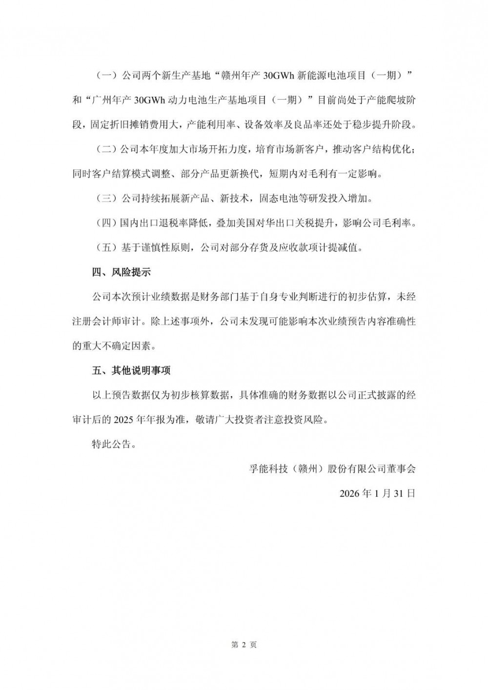(一)公司两个新生产基地“赣州年产30GWh新能源电池项目(一期)”和“广州年产30GWh动力电池生产基地项目(一期)”目前尚处于产能爬坡阶段,固定折旧摊销费用大,产能利用率、设备效率及良品率还处于稳步提升阶段。