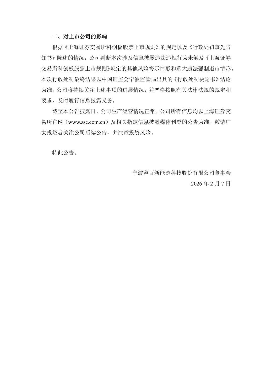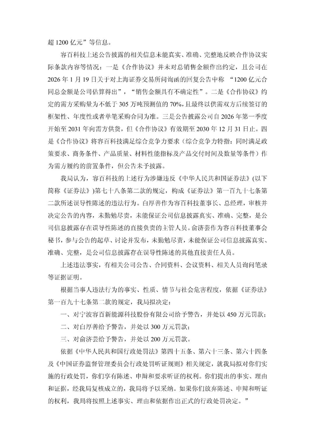 能源圈获悉,2月7日,容百科技披露收到《行政处罚事先告知书》的公告,因公司重大合同公告涉嫌误导性陈述等,根据《中华人民共和国证券法》《中华人民共和国行政处罚法》等法律法规,中国证监会决定对公司立案。容百科技于2026年2月6日收到中国证监会宁波监管局下发的《行政处罚事先告知书》,对宁波容百新能源科技股份有限公司给予警告,并处以450万元罚款;对白厚善给予警告,并处以300万元罚款;对俞济芸给予警告,并处以200万元罚款。共计罚款950万元。