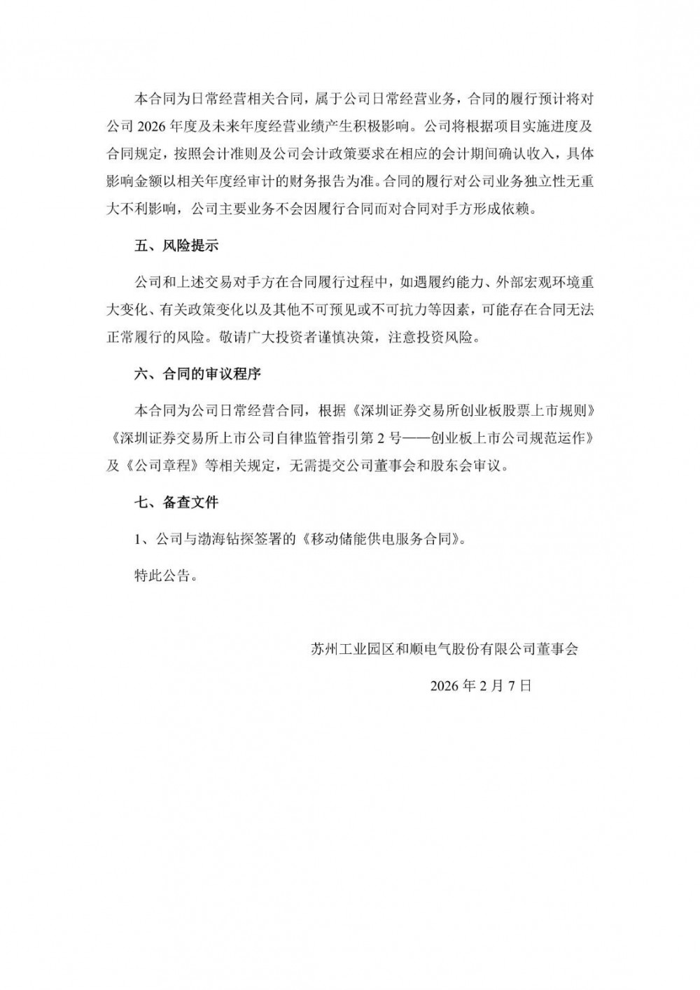 近日,和顺电气发布公告称,公司与中国石油集团渤海钻探工程有限公司就中标项目签订《移动储能供电服务合同》。