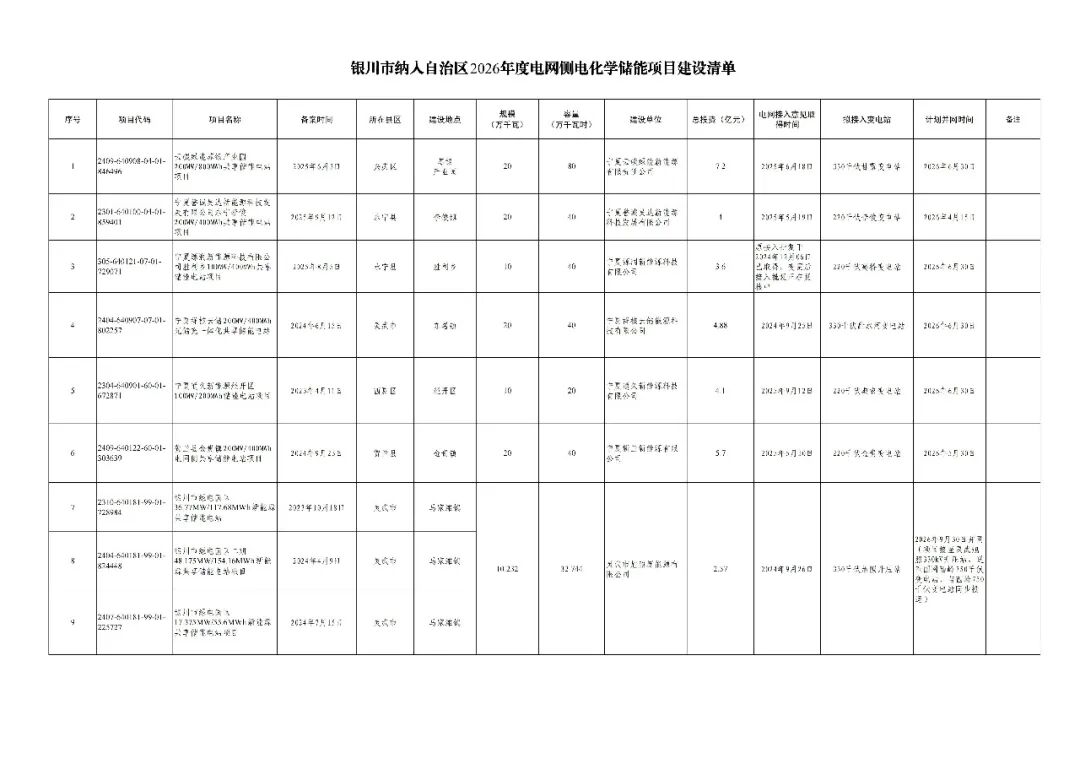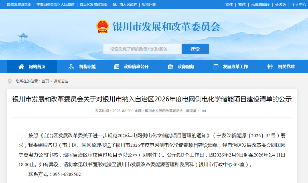 2月9日,银川市发展和改革委员会发布关于对银川市纳入自治区2026年度电网侧电化学储能项目建设清单的公示。