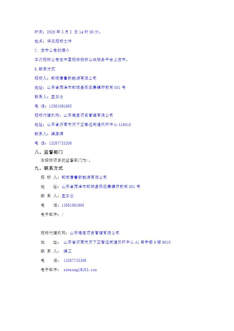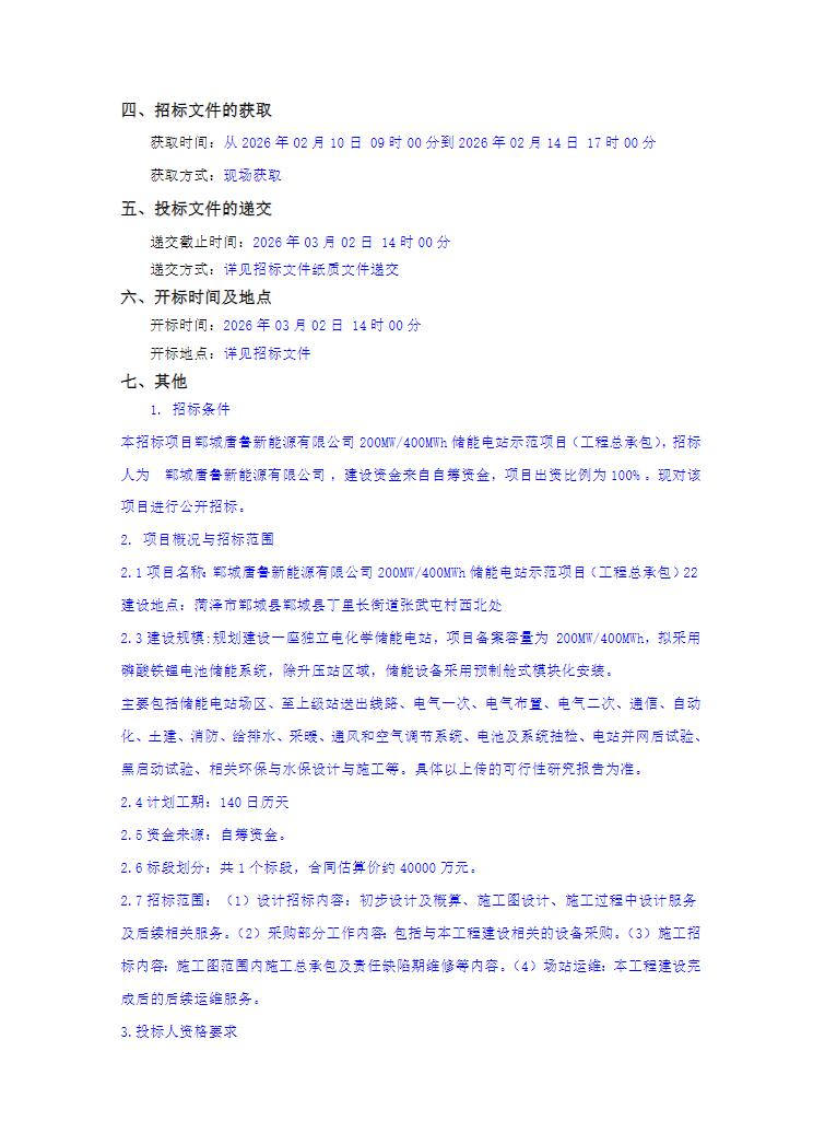 2月9日,郓城唐鲁新能源有限公司200MW/400MWh储能电站示范项目(工程总承包)招标公告发布。
