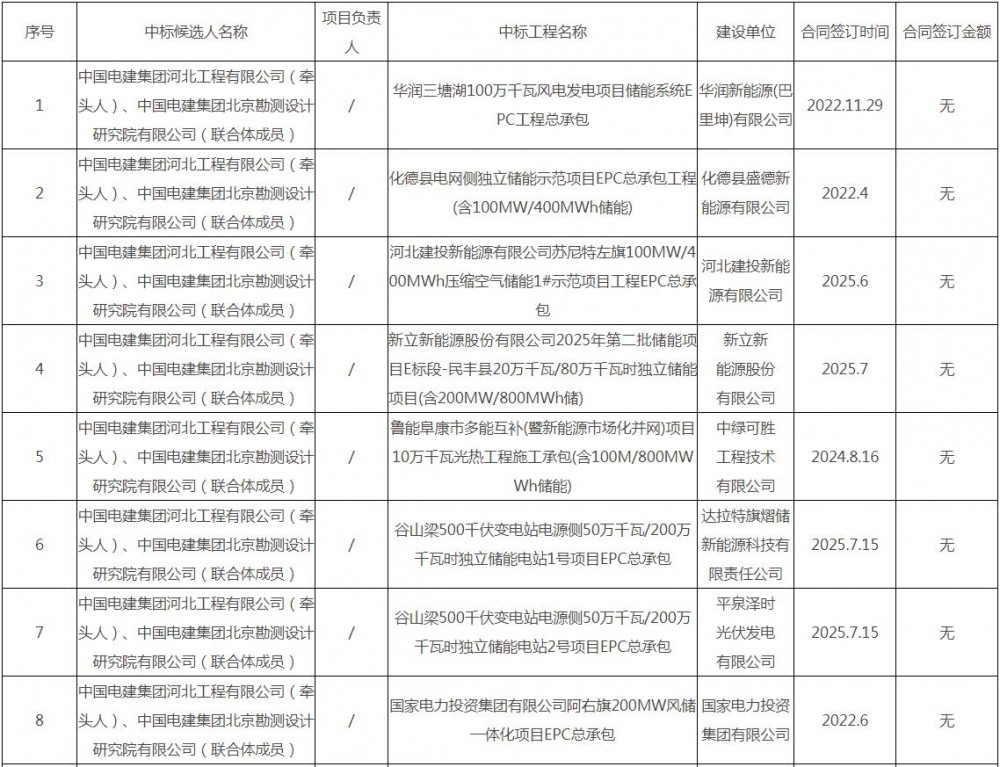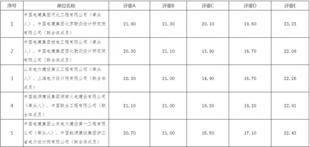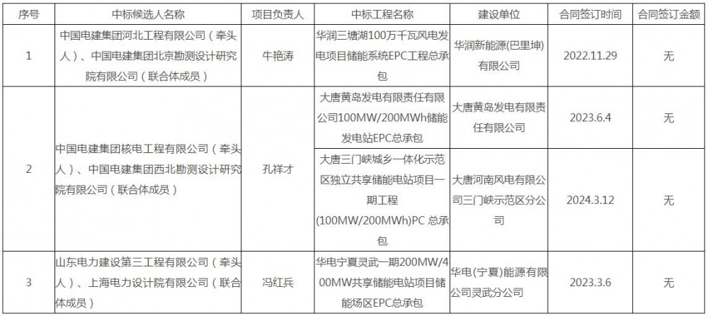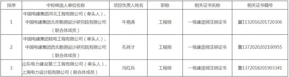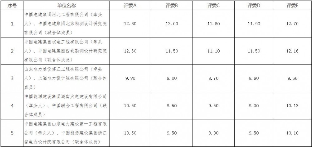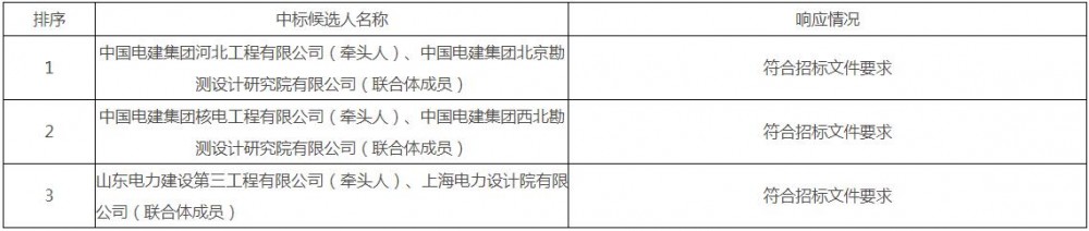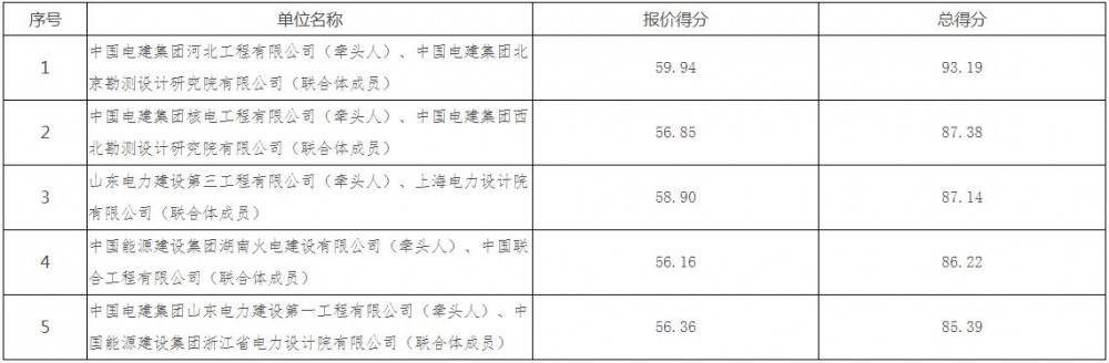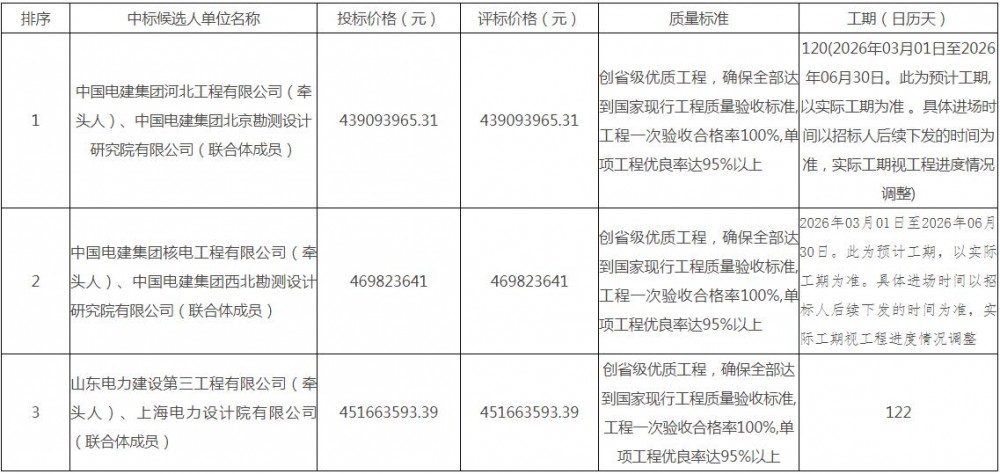 第一中标候选人为中国电建集团河北工程有限公司、中国电建集团北京勘测设计研究院有限公司联合体,投标报价为439093965.31元,折合单价0.7318元/Wh;第二中标候选人为中国电建集团核电工程有限公司、中国电建集团西北勘测设计研究院有限公司联合体,投标报价为469823641元,折合单价0.783元/Wh;第三中标候选人为山东电力建设第三工程有限公司、上海电力设计院有限公司联合体,投标报价为451663593.39元,折合单价0.7528元/Wh。