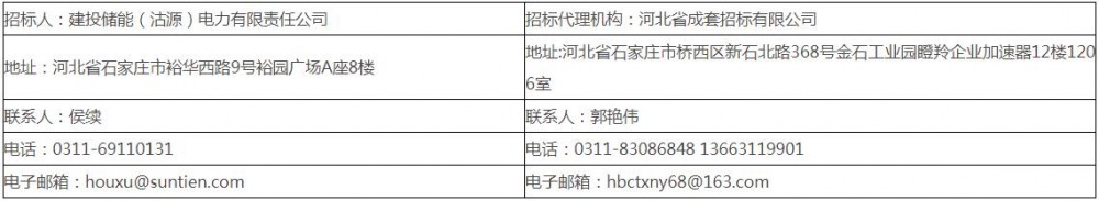 招标人:建投储能(沽源)电力有限责任公司,地址:河北省石家庄市裕华西路9号裕园广场A座8楼,联系人:侯续,电话:0311-69110131,电子邮箱:houxu@suntien.com;招标代理机构:河北省成套招标有限公司,地址:河北省石家庄市桥西区新石北路368号金石工业园瞪羚企业加速器12楼1206室,联系人:郭艳伟、林莉,电话:0311-83086848/13663119901,电子邮箱:hbctxny68@163.com。