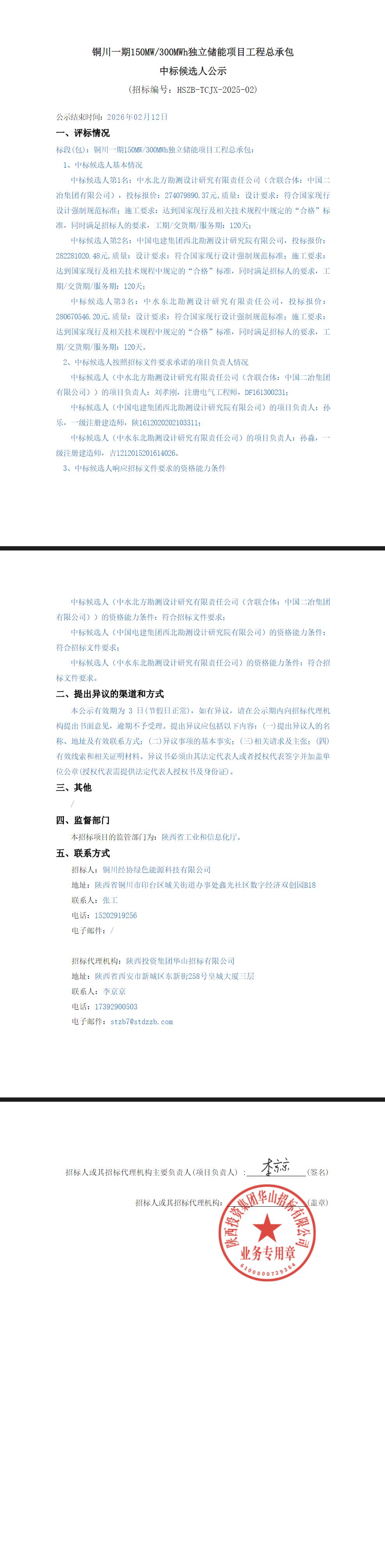 2月10日,铜川一期150MW/300MWh独立储能项目工程总承包中标候选人公示。