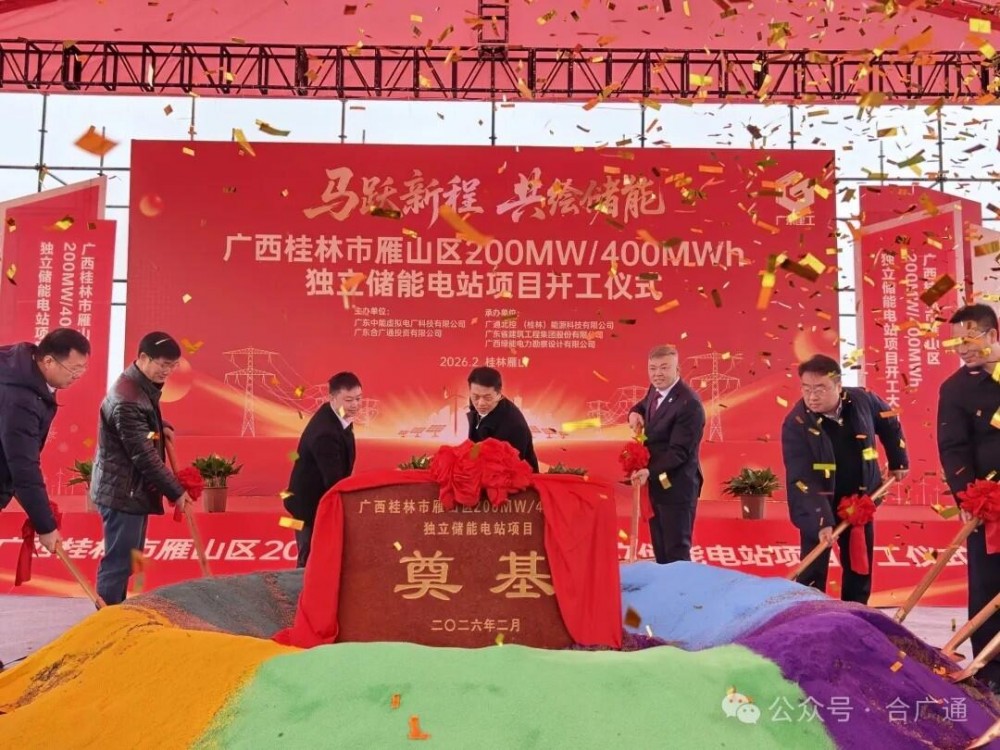 2月10日,由广东合广通投资有限公司主导开发、广西自治区重大项目——桂林市雁山区200MW/400MWh独立储能项目正式开工建设。广西桂林市雁山区委书记李强,区委副书记、区长潘军华等区领导出席开工仪式,合广通董事长黄小根携管理团队、战略合作方广东中能虚拟电厂科技有限公司总经理何腾飞率其管理团队共同参与,并为项目培土奠基。