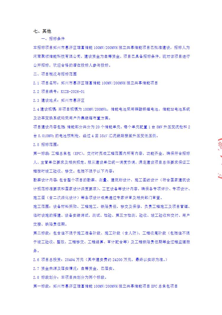 2月11日,郑州市惠济区雄富储能100MW/200MWH独立共享储能项目招标公告发布。