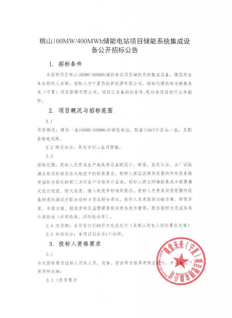 2月10日,桃山100MW/400MWh储能电站项目储能系统集成设备公开招标公告发布。