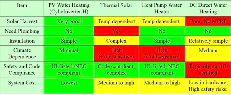 CyboInverter H型号能将电热水器转变为太阳能储存系统,无需电池、管道或维护。如图所示,该系统由多个太阳能电池板和CyboInverter H组成,直接将太阳能输送到热水器下部加热元件,设定较高温度,确保上部元件仅在大量用水时激活电网电力。光伏热水系统相比传统热太阳能系统,具有简单、清洁、安全和免维护优势。
