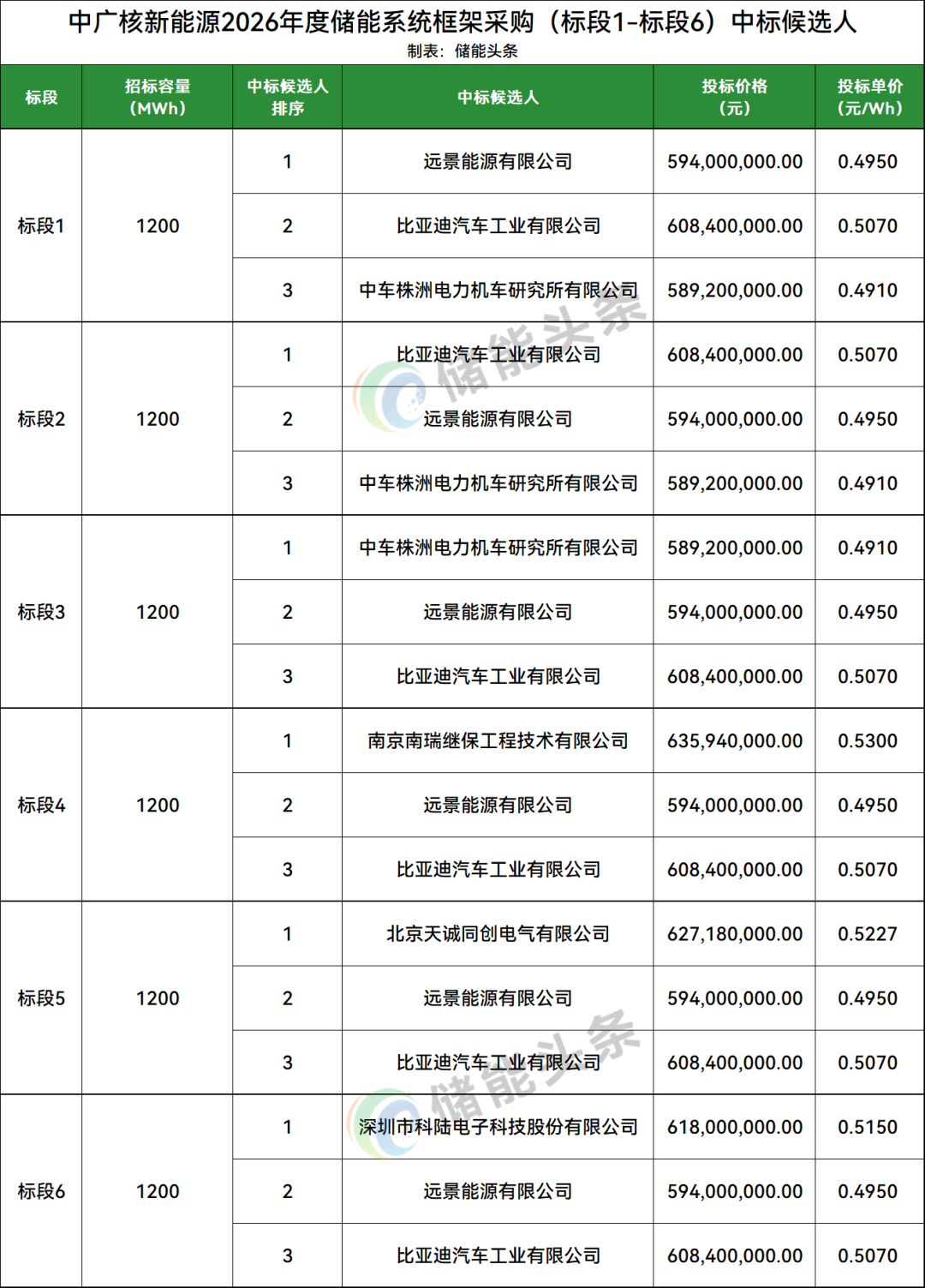 远景能源、比亚迪、中车株洲所、科陆电子、南瑞继保、天诚同创6家企业入围,投标单价处于0.491-0.53元/Wh。