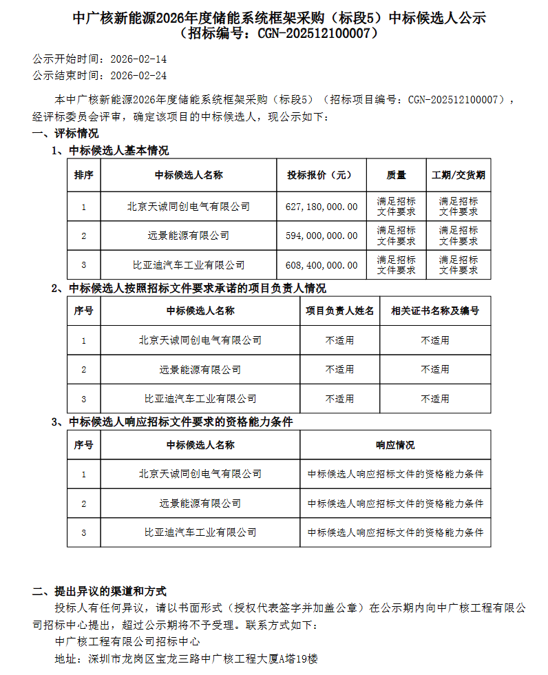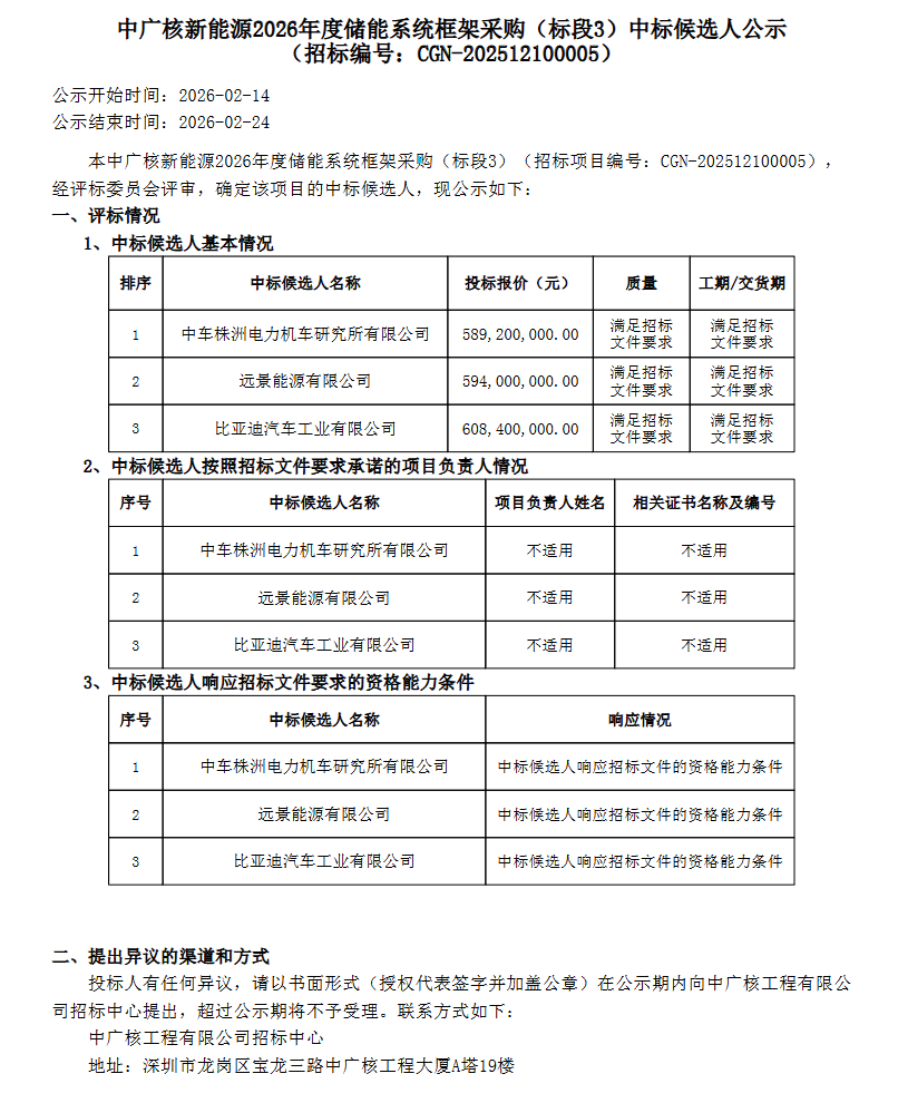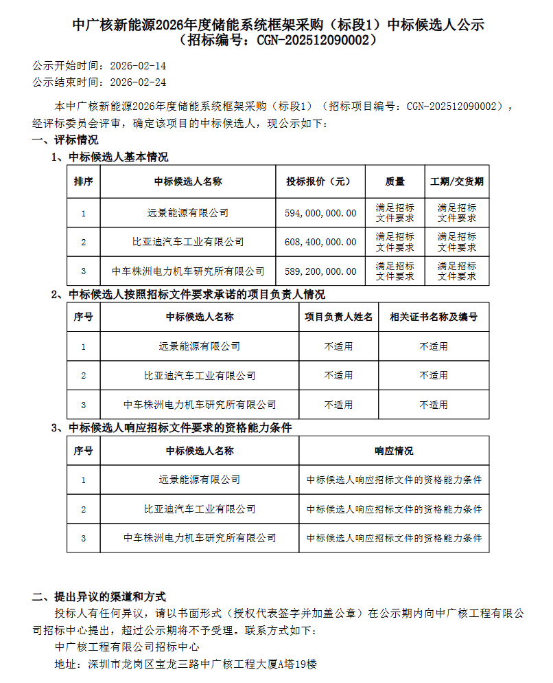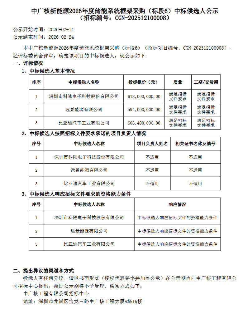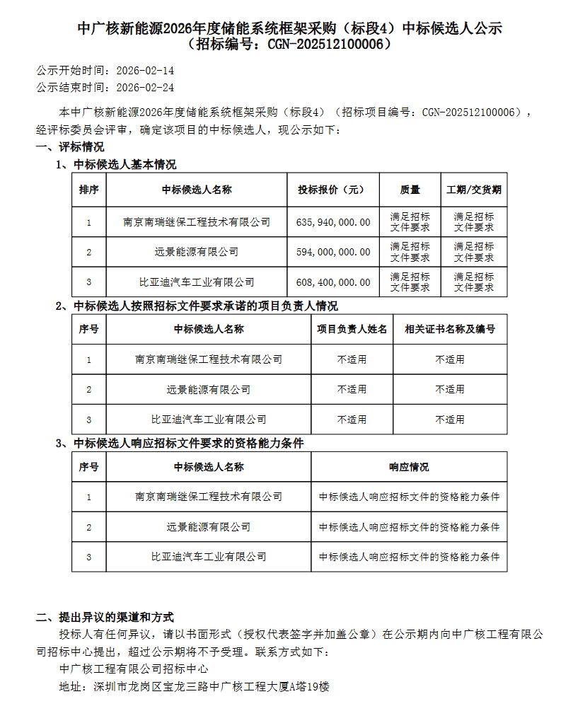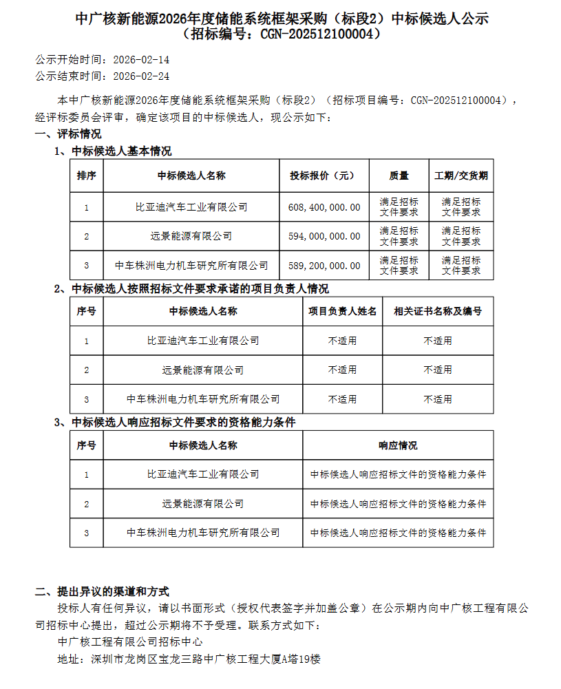 能源圈获悉,2月14日,中广核新能源2026年度储能系统框架采购(标段1-标段6)中标候选人公示。