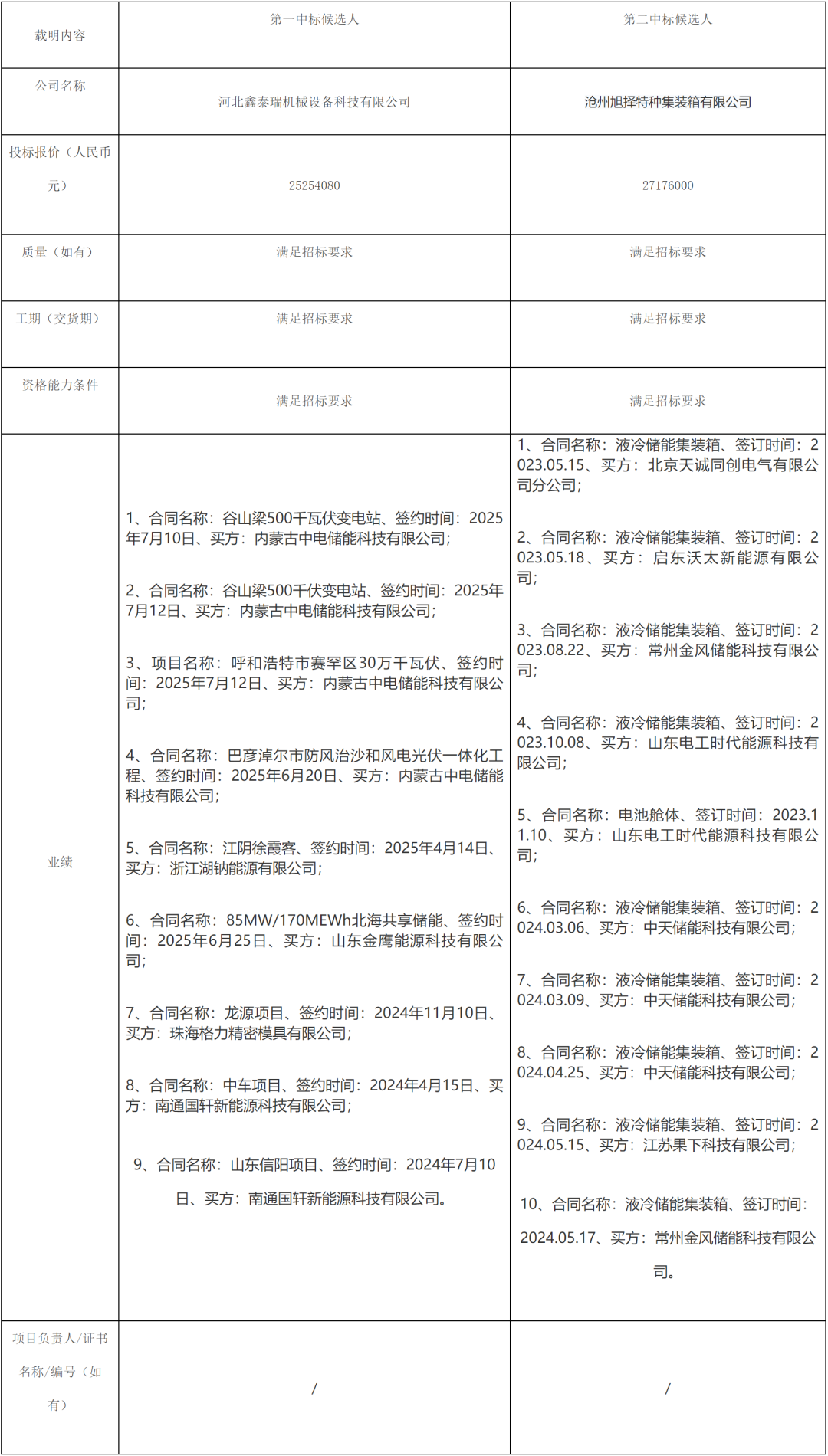 第一中标候选人为河北鑫泰瑞机械设备科技有限公司,投标报价为25254080元;第二中标候选人为沧州旭择特种集装箱有限公司,投标报价为27176000元。