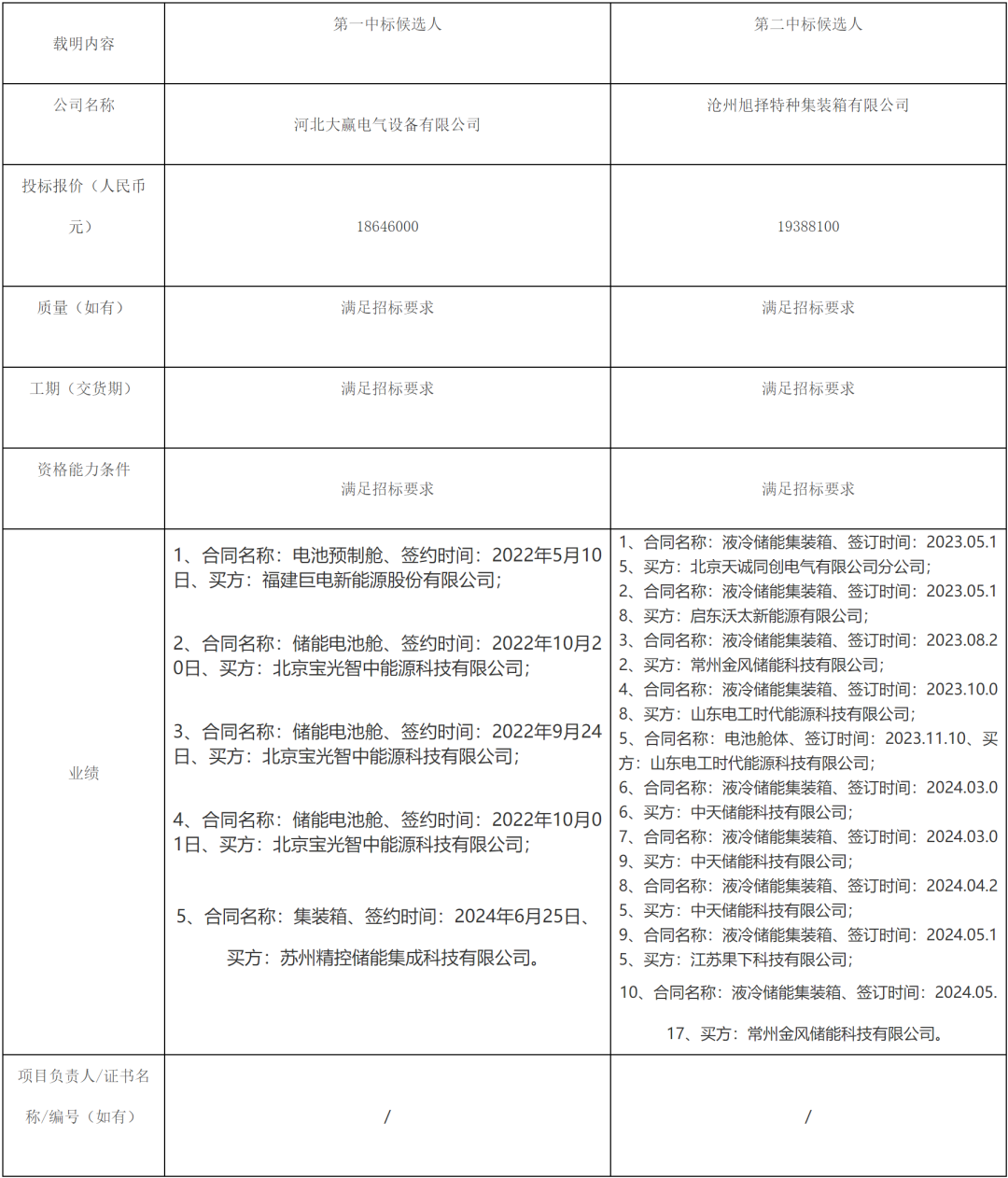 第一中标候选人为河北大赢电气设备有限公司,投标报价为18646000元;第二中标候选人为沧州旭择特种集装箱有限公司,投标报价为19388100元。