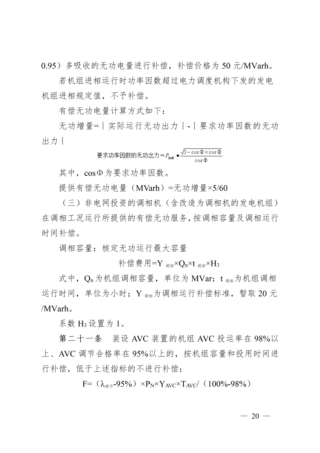 根据电力调度指令,并网主体通过提供必要的有偿无功服务保证电厂母线电压满足要求,或者已经按照最大能力发出或吸收无功也无法保证母线电压满足要求时,对发电侧并网主体比迟相功率因数(其中火电、燃机为0.85,水电、光伏、风电为0.9,独立新型储能为0.8)多发出的无功电量或比进相功率因数(其中火电、燃机、水电、独立新型储能为0.97,风电、光伏为0.95)多吸收的无功电量进行补偿,补偿价格为50元/MVarh。