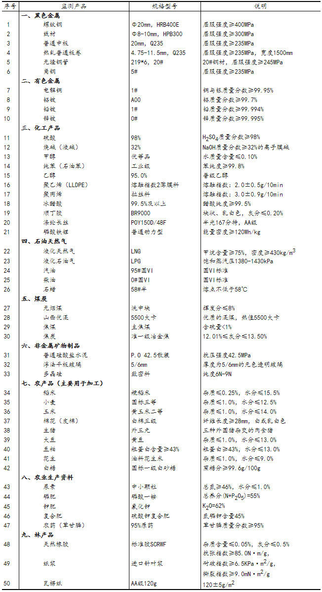 流通领域重要生产资料市场价格监测内容包括9大类50种产品的价格。类别与产品规格说明详见附表。
