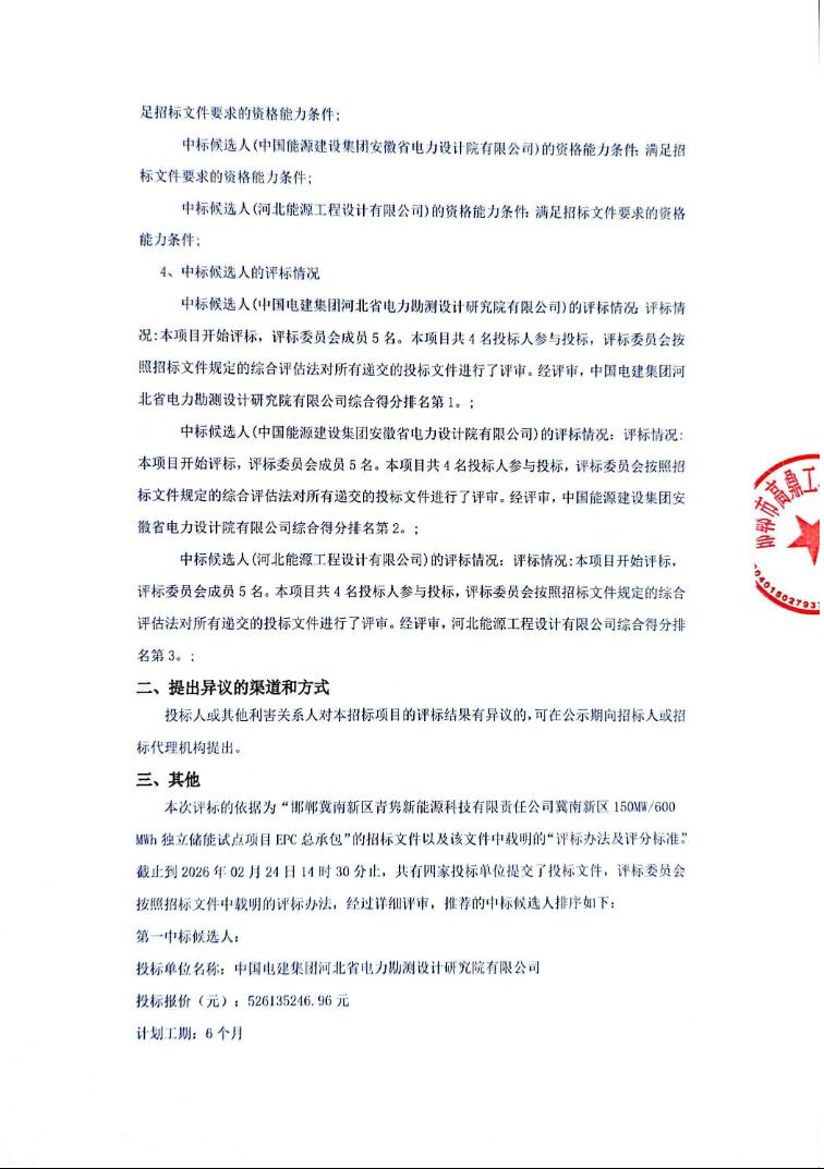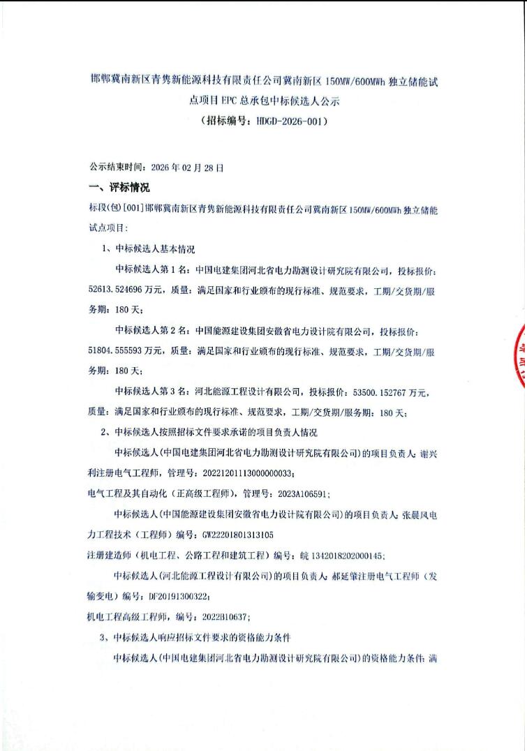 2月25日,邯郸冀南新区青隽新能源科技有限责任公司冀南新区150MW/600MWh独立储能试点项目EPC总承包中标候选人公示。